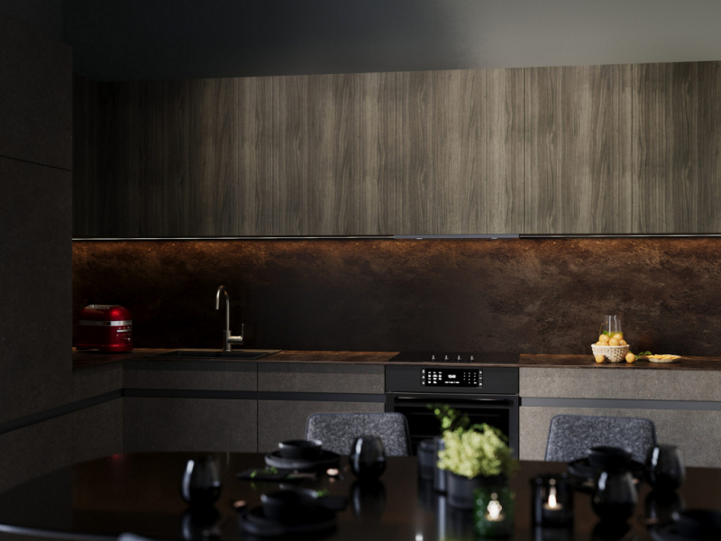 Kao primer, predstavljamo projekat moderne ugaone kuhinje u minimalističkom stilu, gde su korišćeni frontovi TERRA i ORLANDO iz prve cenovne kategorije. Front TERRA, novitet za 2024. godinu, u imitaciji betona sa suptilnim obojenim inkluzijama, savršeno se uklapa uz tamno drvo, unoseći stabilnost i prefinjenost u prostor.