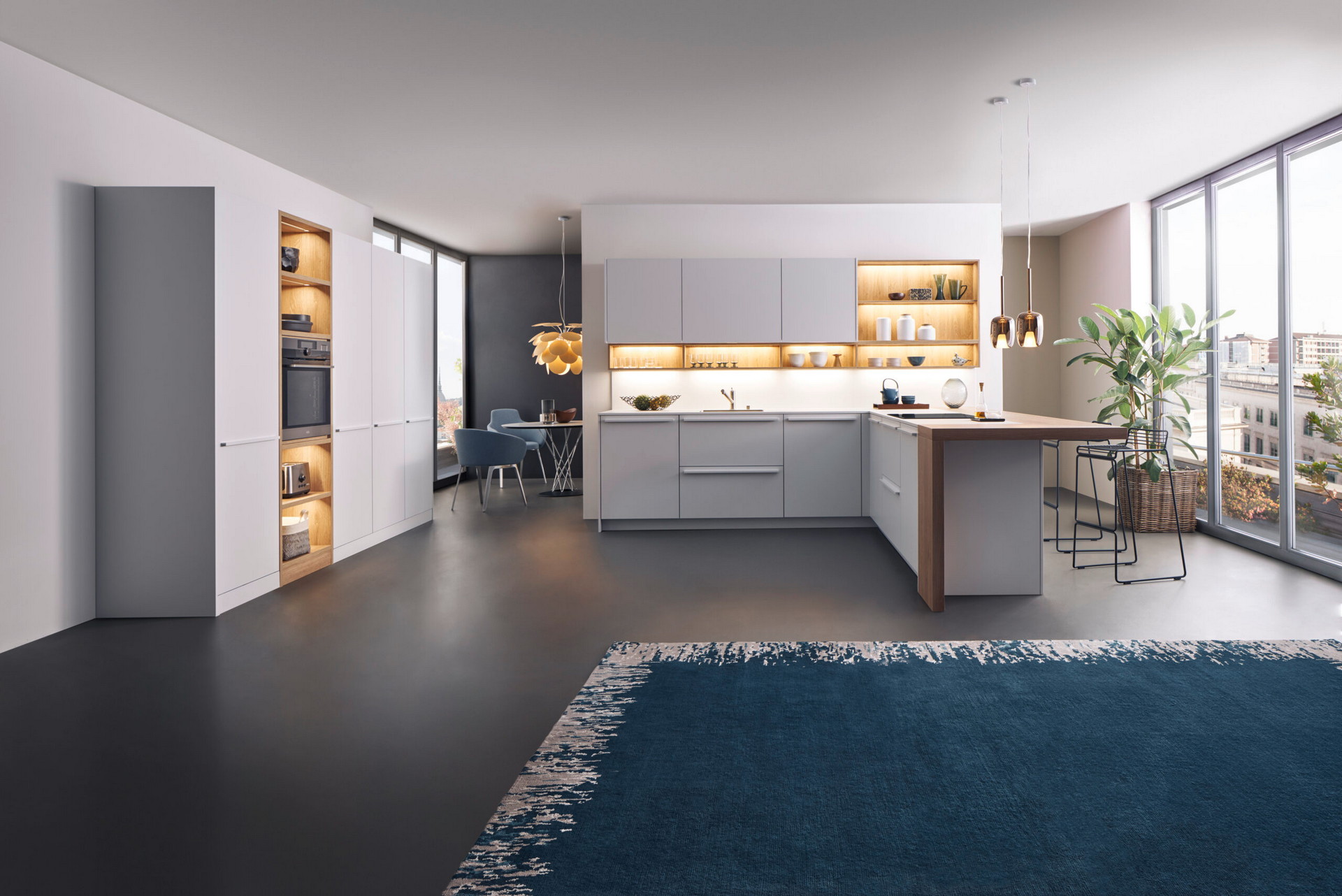 Za površine kod kojih su ručke suvišne, LEICHT nudi dve savremene opcije otvaranja: mehanički sistem „Sesam“ za klasična krilna vrata i električni sistem podizanja frontova kod gornjih elemenata. U ovoj kuhinji izabrano je električno rešenje – praktični „lift“ mehanizam omogućava da se vrata otvore jednim dodirom, a zatvore jednostavnim pritiskom na dugme. Estetika ostaje besprekorna, a funkcionalnost vrhunska.