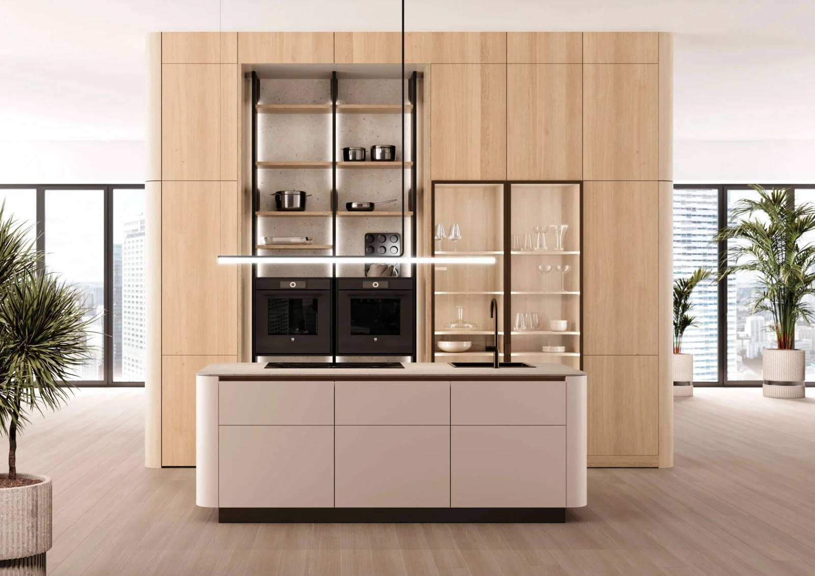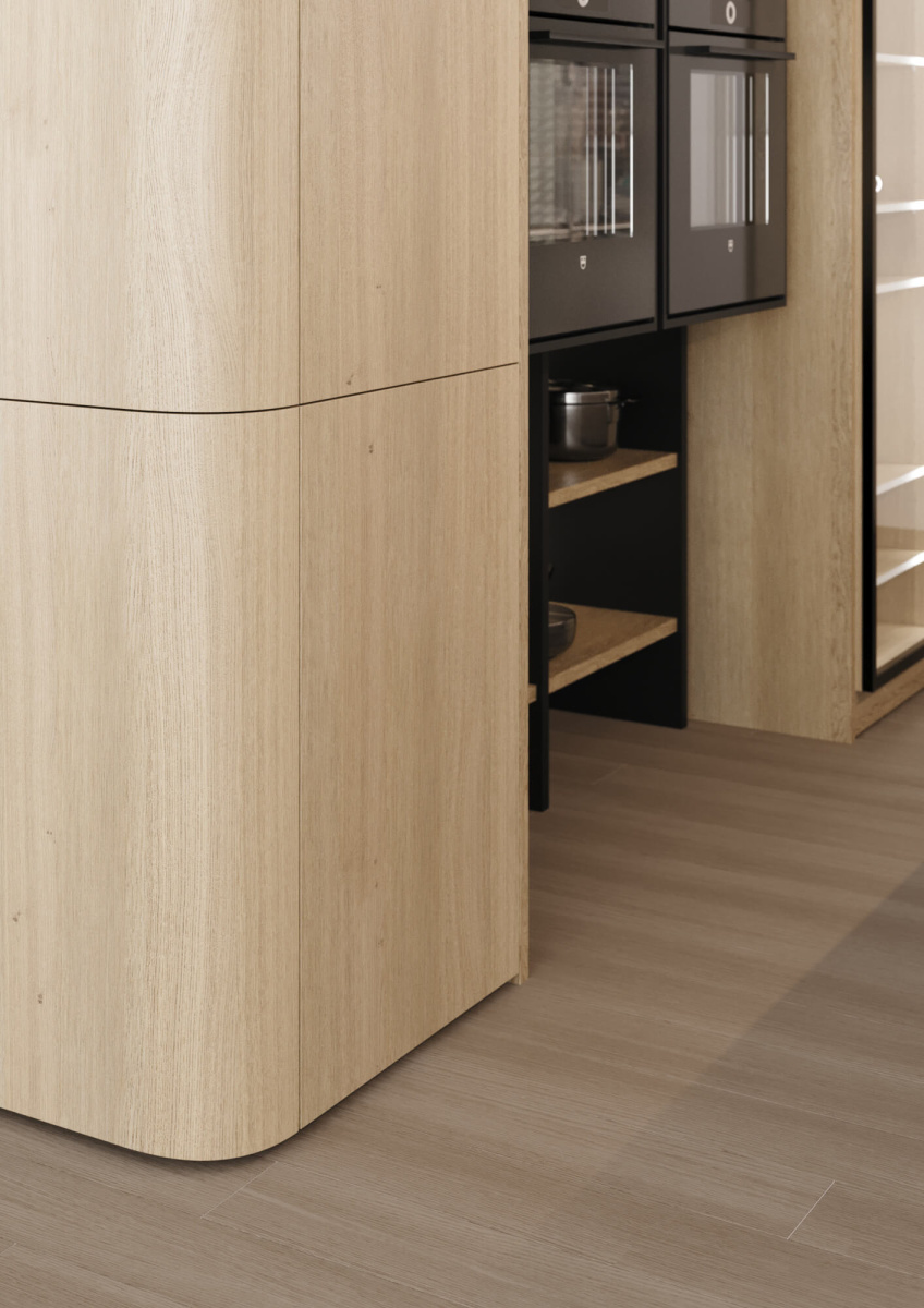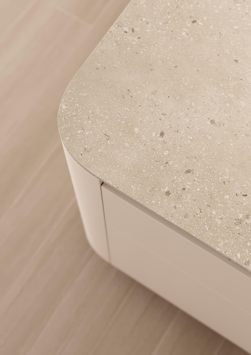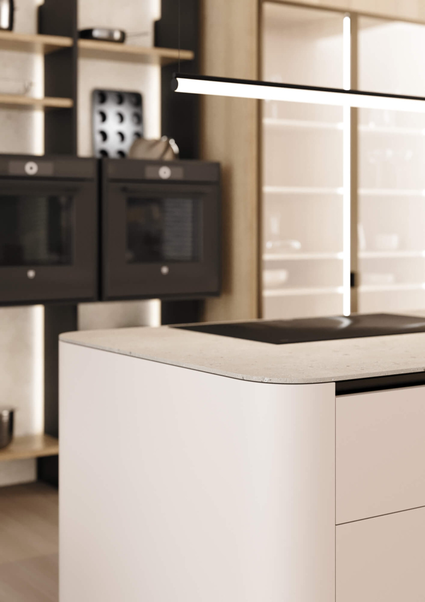 Radna površina od kompaktnog materijala, s prirodnim elementima u samoj strukturi materijala dodatno naglašava prefinjen izgled kuhinje. Raskošno obrađeni uglovi blago prelaze u zakrivljenu siluetu. Nežno zaobljene završne stranice radne ploče prate donju formu bočnih stranica i daju karakter skulpture što dizajnerski vrednuje celokupan prostor.Rezultat je moderna kuhinja i dnevna zona sa stilom.Jednom rečju prostor gde dizajn postaje doživljaj.
