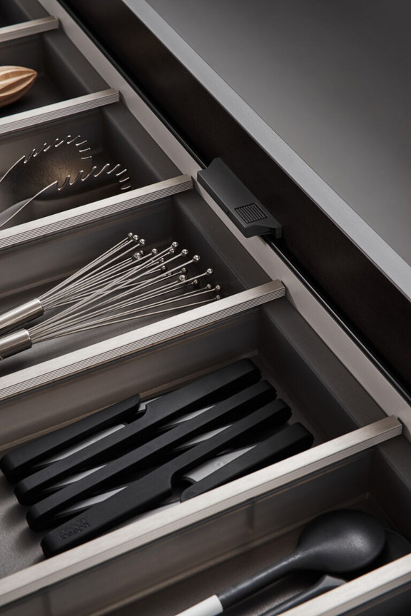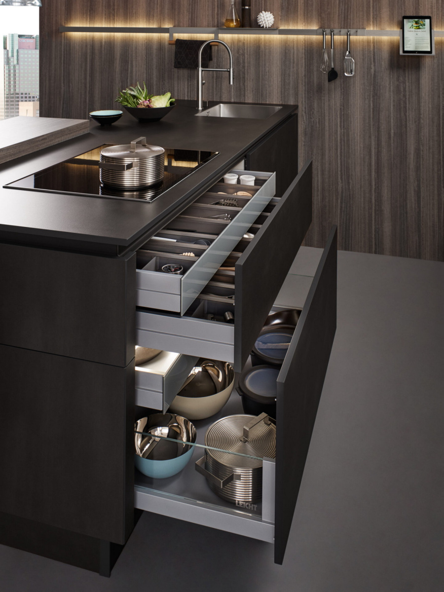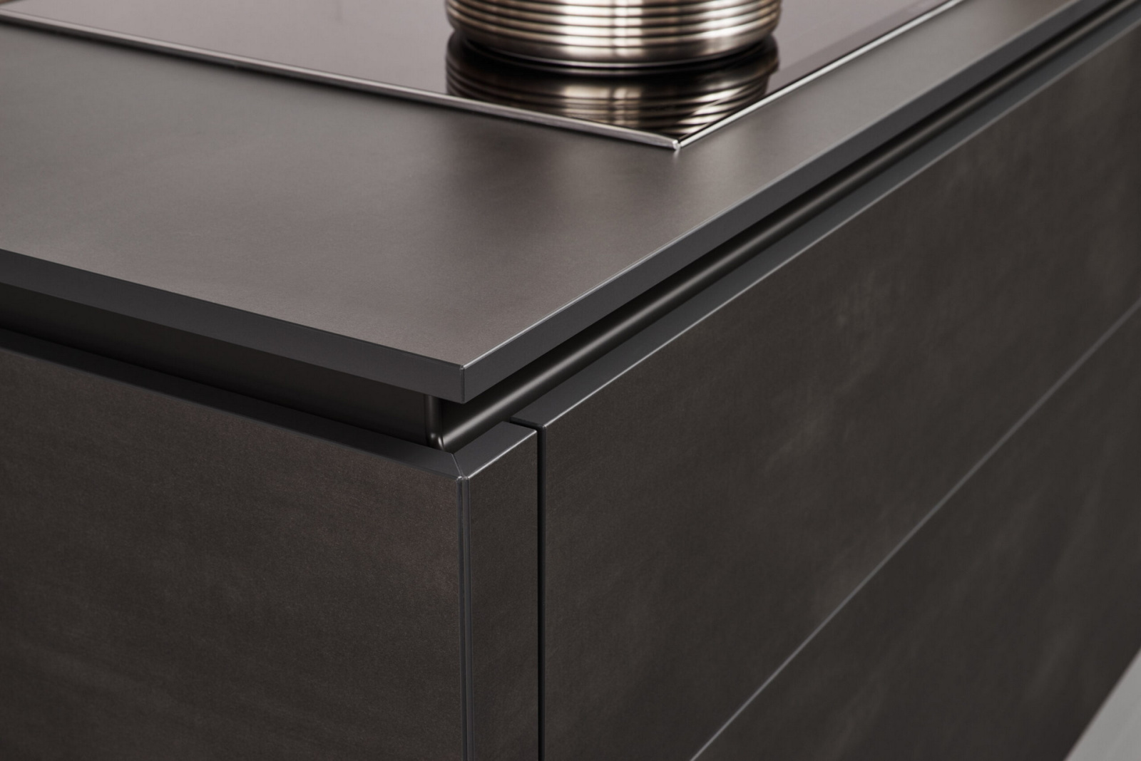 Prednja strana fasade Minera je sa melaminskom smolom i super mat završnom obradom laka na prednjoj strani. Specijalni lak stvara prijatnu površinu na neobičnoj površini i dizajniran je sa efektom otpornosti na otiske prstiju. Zadnja strana stola je melamin obložen ukrasnim cvećem. Duž perimetra zaobljene su debele plastične ivice. Ostrvo urađeno u kombinaciji program Contino i P1, sa c-profilom ručkom za gornje fioke i donjim fiokama sa otvaranjem na pritisak.