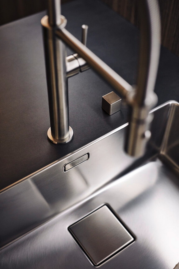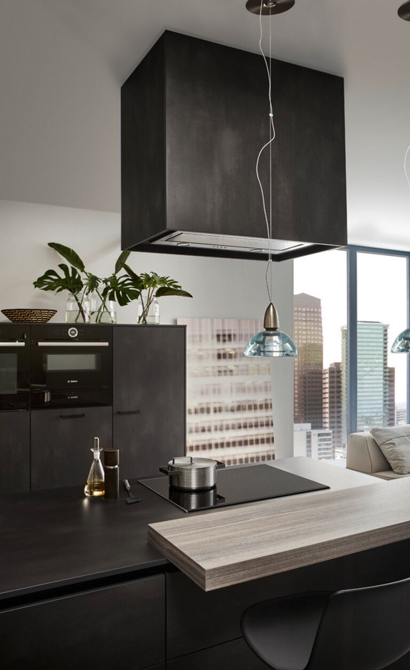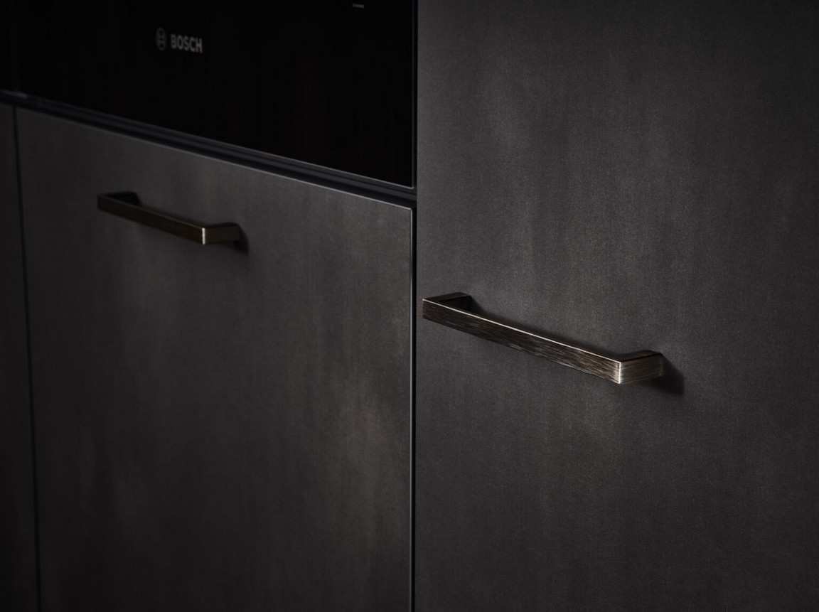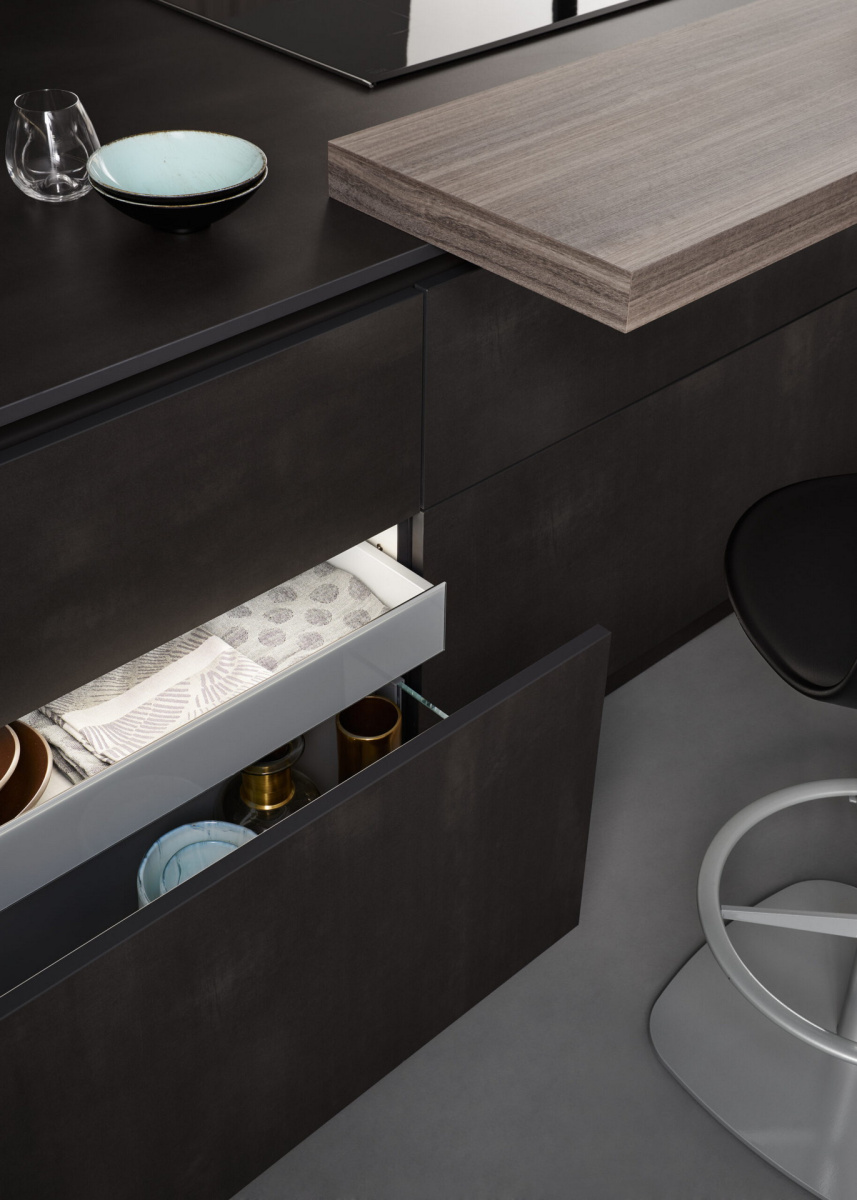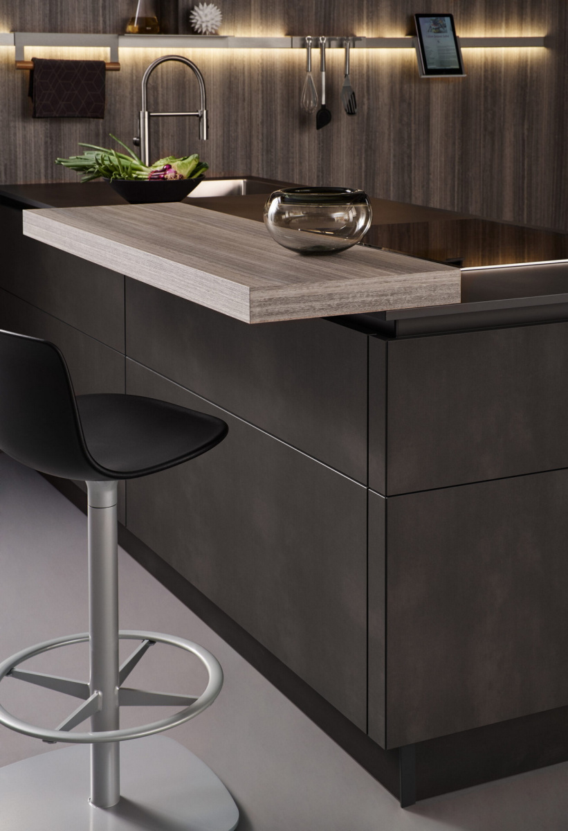 Soba kao celina, kuhinja i dnevni boravak su jedno. Dve površine, koje su ovde kombinovane na moderan način, izgledaju toplo i prirodno: fascinantne su svojim blago metalnim svetlucanjem i visokokvalitetnom replikacijom fino strukturiranog drveta eukaliptusa.