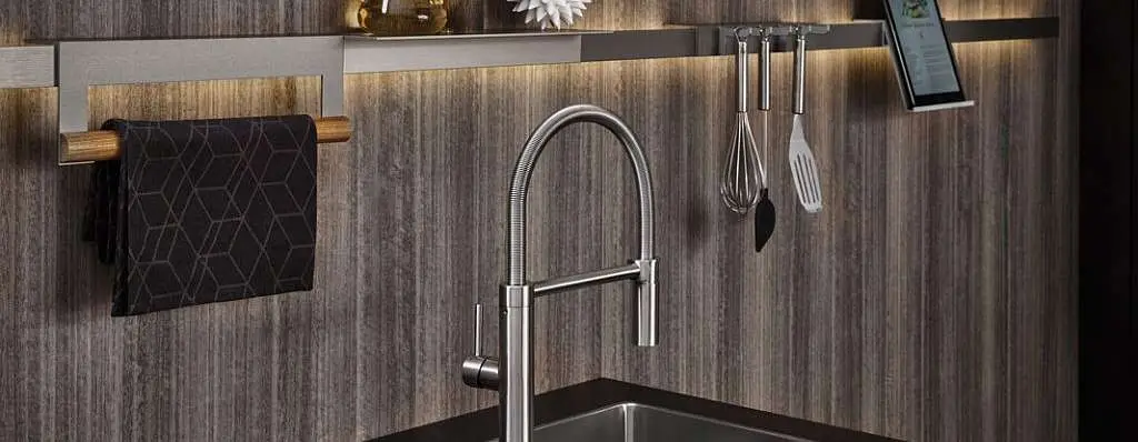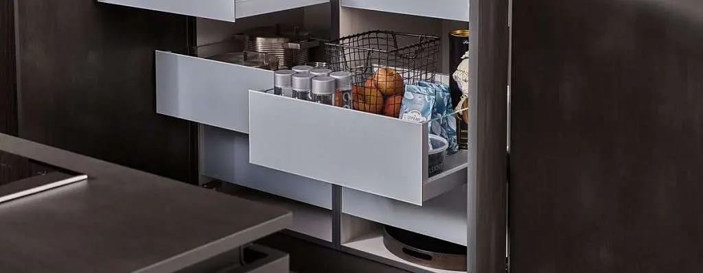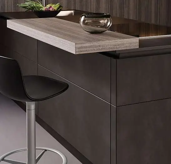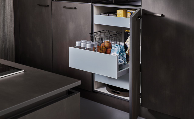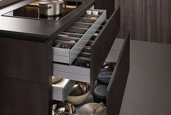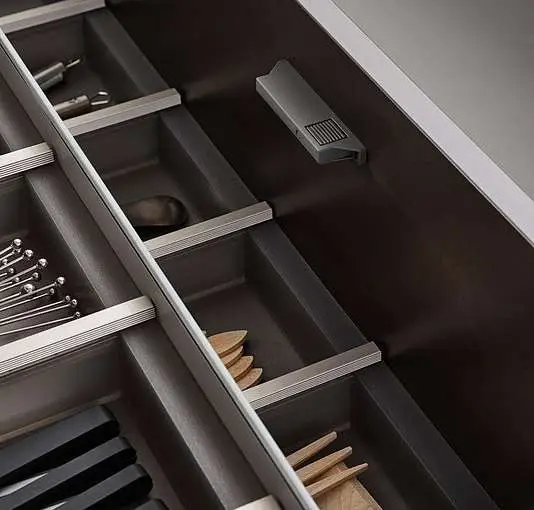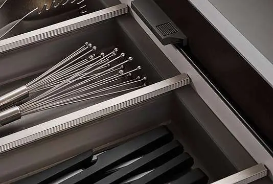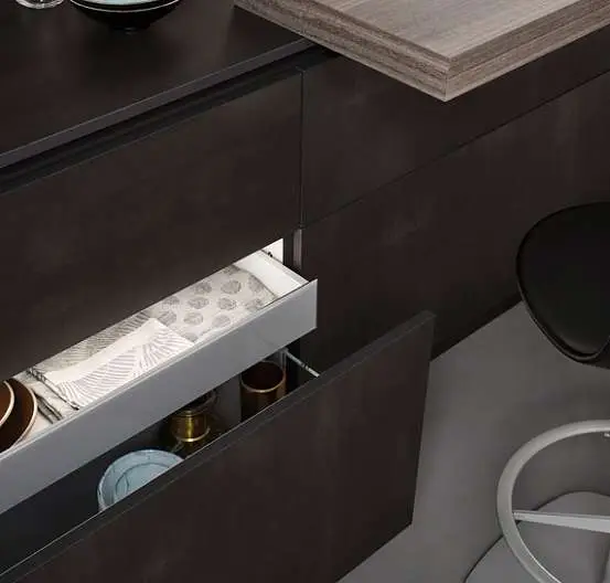 Središnje kuhinjsko ostrvo je projektovano kao kombinacija programa CONTINO i P1, sa diskretnim C-profil ručkama na gornjim fiokama, dok se donje fioke otvaraju na dodir (push-to-open) – spoj elegancije i praktičnosti.