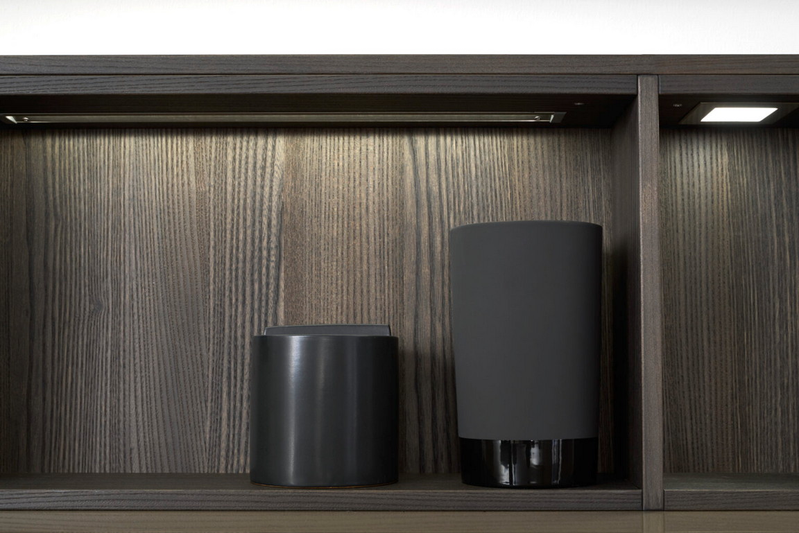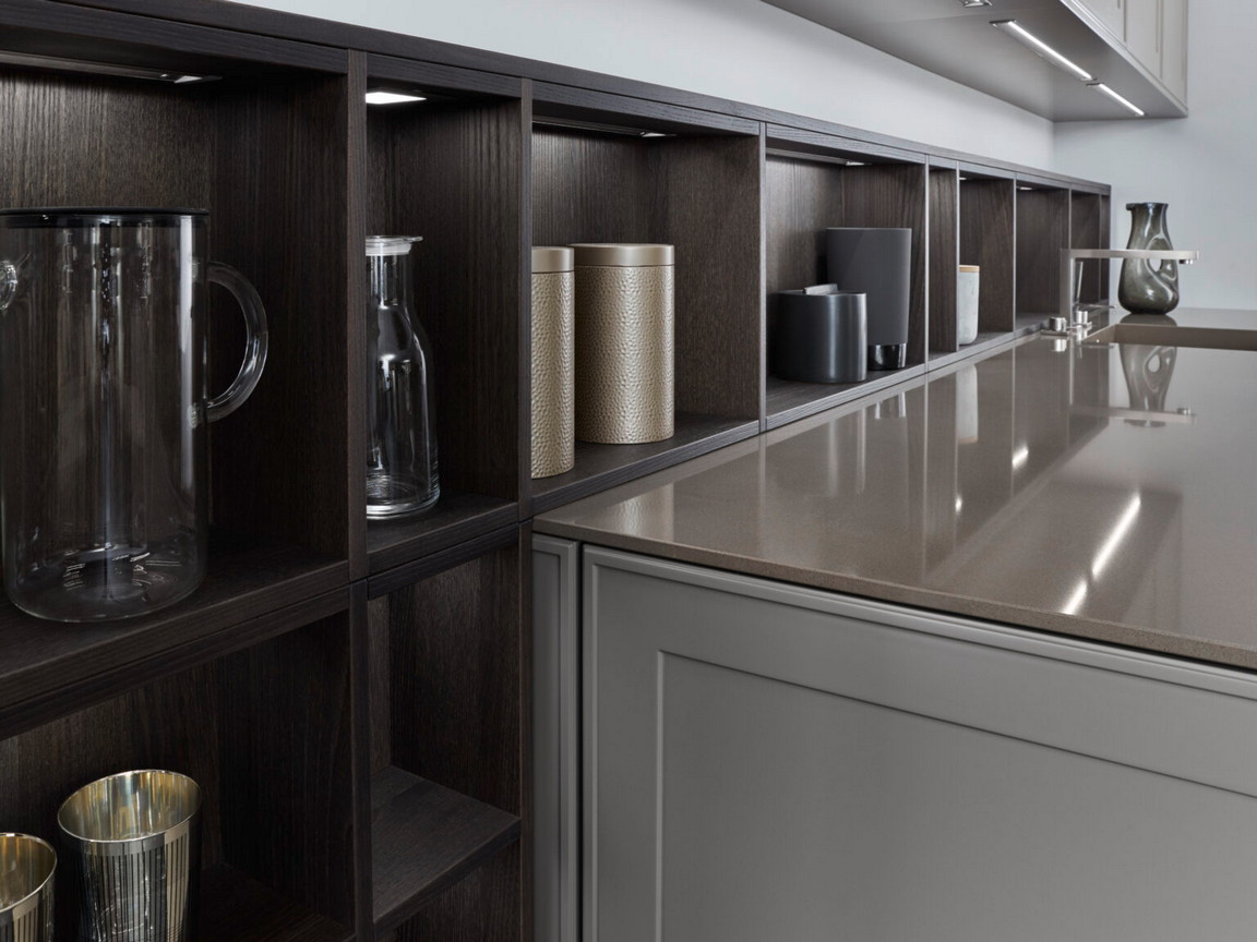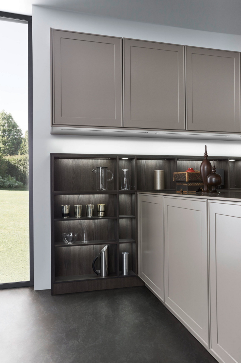 Kuhinja za čula: karakteristični frontovi okvira fasade Verve, u kombinaciji sa otvorenim, individualno planiranim elementima polica, harmonično su usklađeni jedni s drugima u pogledu materijala i boja: topla, prirodna Umbra iz palete boja Les Couleurs® Le Corbusier u ponudi ekskluzivno od LEICHT-a savršeno je usklađena sa policama i zidnim panelom sa integrisanom klupom, oboje napravljeno od tamnog, fino strukturiranog pravog drveta fasade Topos.