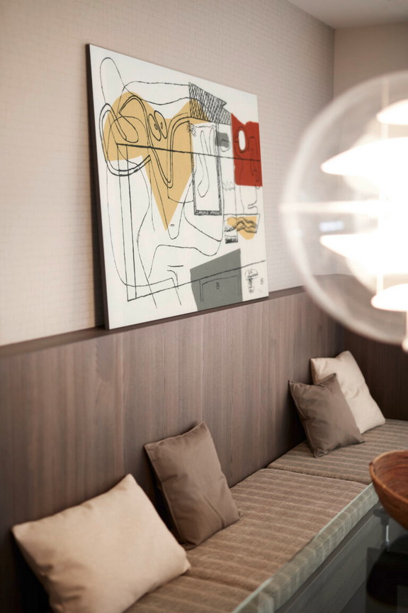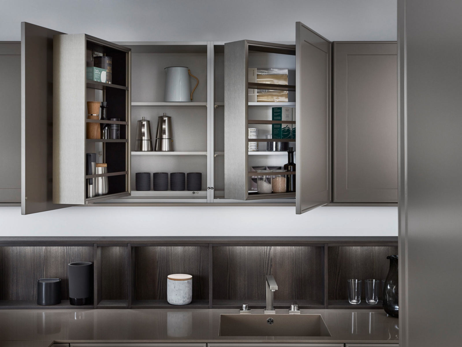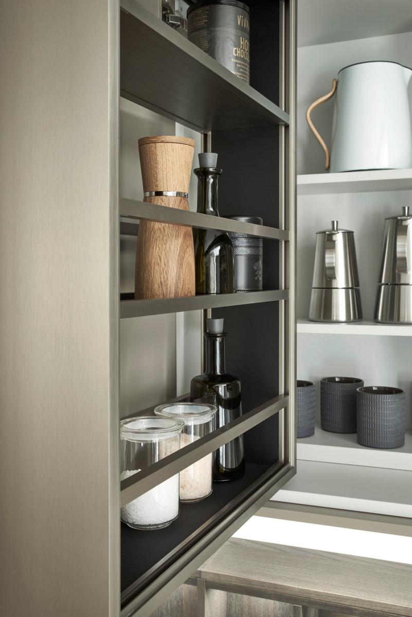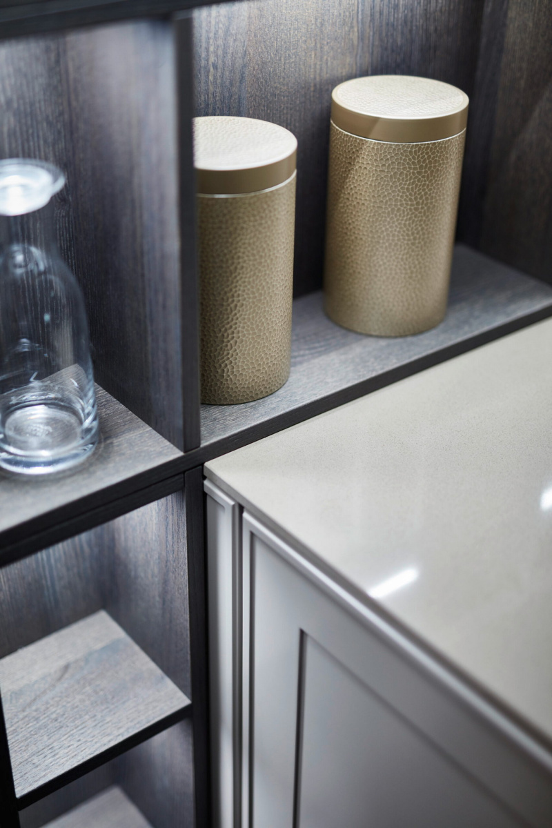Kuhinja za čula: karakteristični frontovi okvira fasade Verve, u kombinaciji sa otvorenim, individualno planiranim elementima polica, harmonično su usklađeni jedni s drugima u pogledu materijala i boja: topla, prirodna Umbra iz palete boja Les Couleurs® Le Corbusier u ponudi ekskluzivno od LEICHT-a savršeno je usklađena sa policama i zidnim panelom sa integrisanom klupom, oboje napravljeno od tamnog, fino strukturiranog pravog drveta fasade Topos.