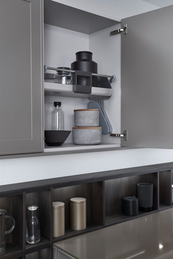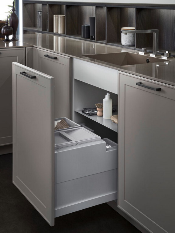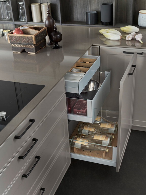 Takođe, karakteristika ove kuhinje je radna ploča od kaljenog stakla obojenog u boji fasade.