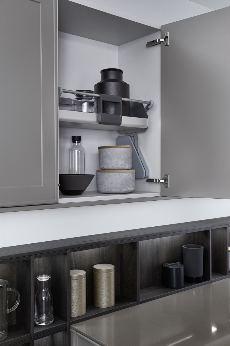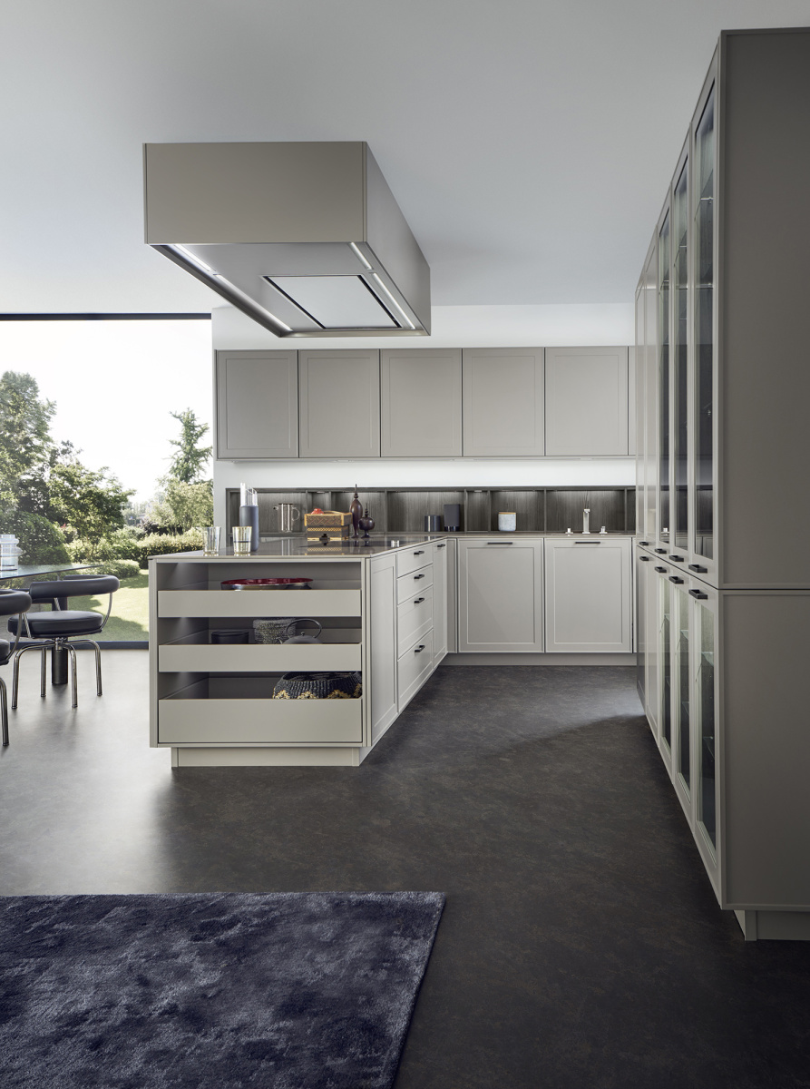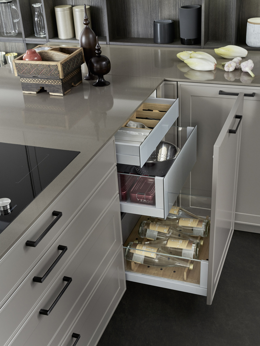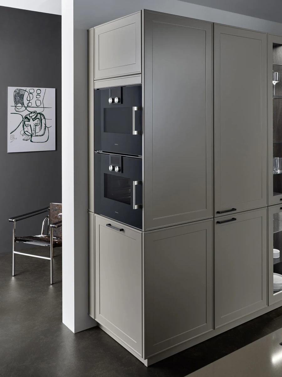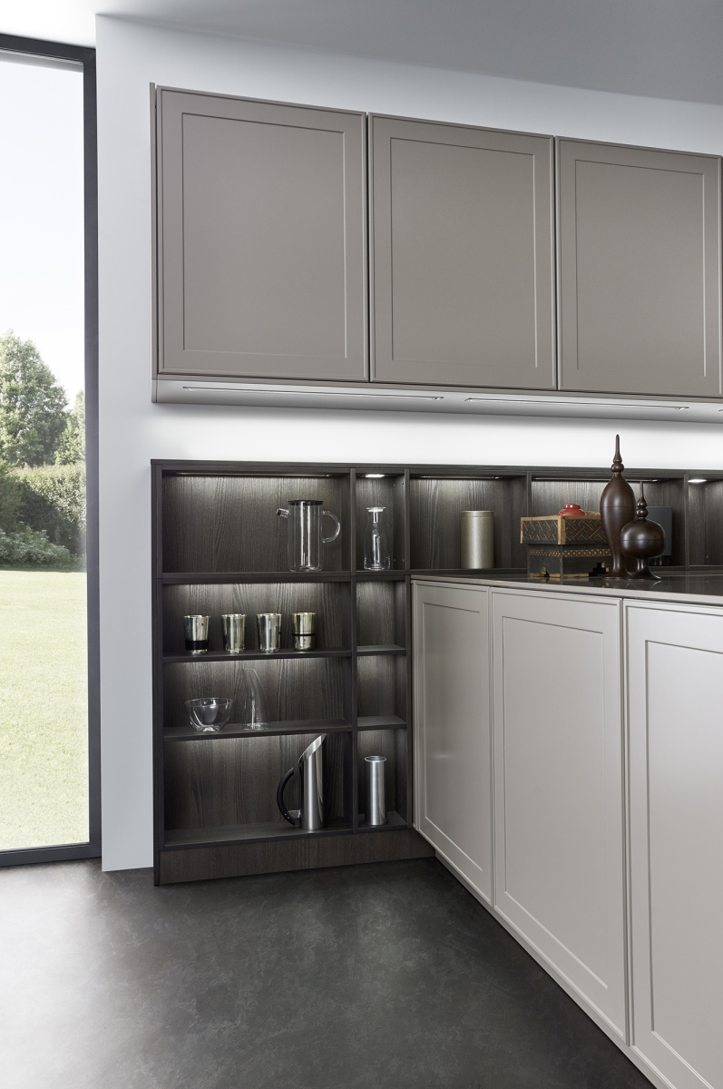 U ovom rešenju dominira kuhinjski front VERVE, sa karakterističnim frizom sa prednje strane u klasičnom stilu. Otvorene police su projektovane da daju lični pečat ovoj kuhinji i skladno su uklopljene kako po materijalu, tako i po boji. Nijansa UMBRA, iz ekskluzivne Le Corbusier kolekcije, donosi prirodnu toplinu, i savršeno se uklapa sa zidnim panelima i klupom od tamnog, fino obrađenog pravog drveta iz kolekcije TOPOS.