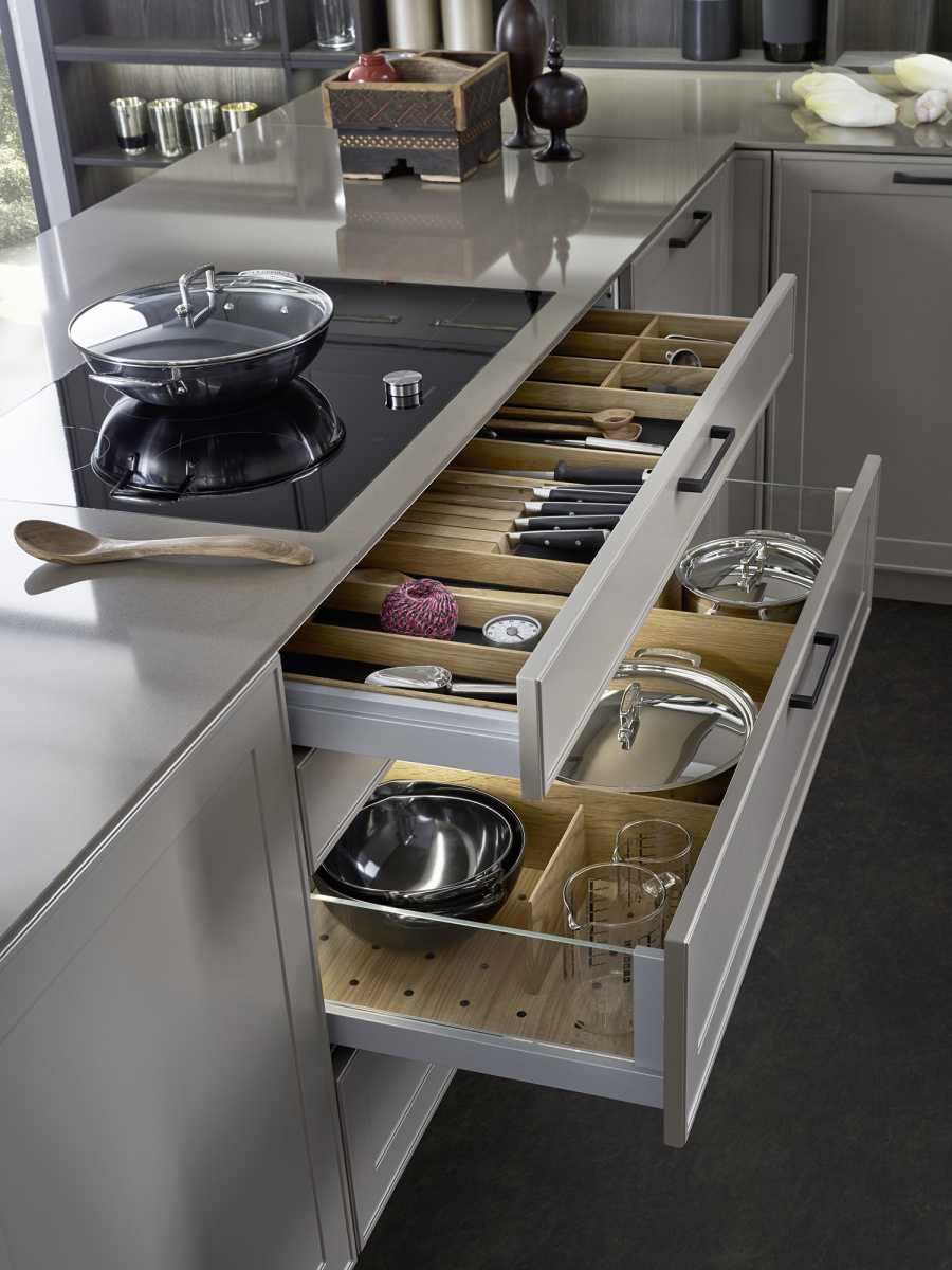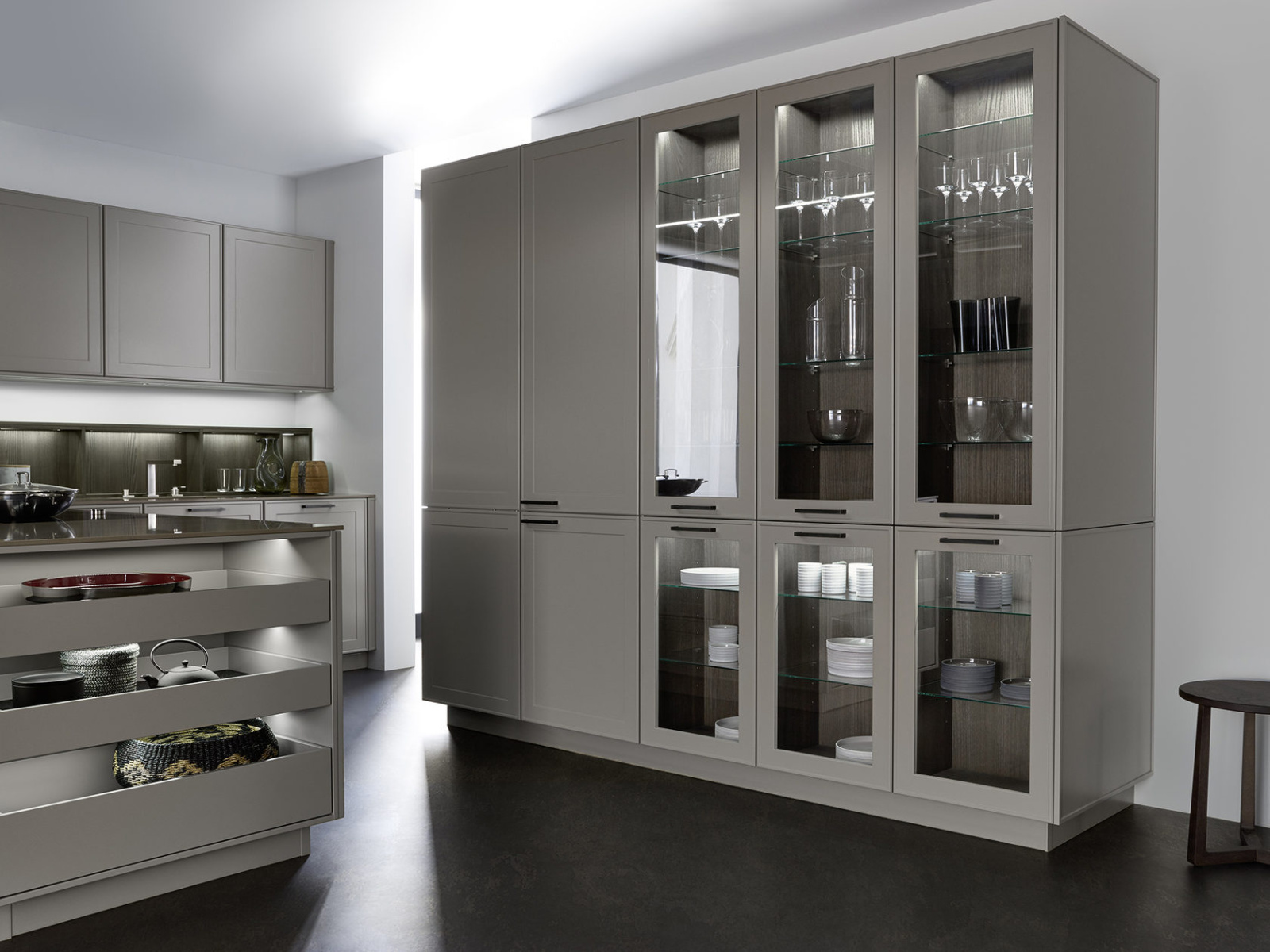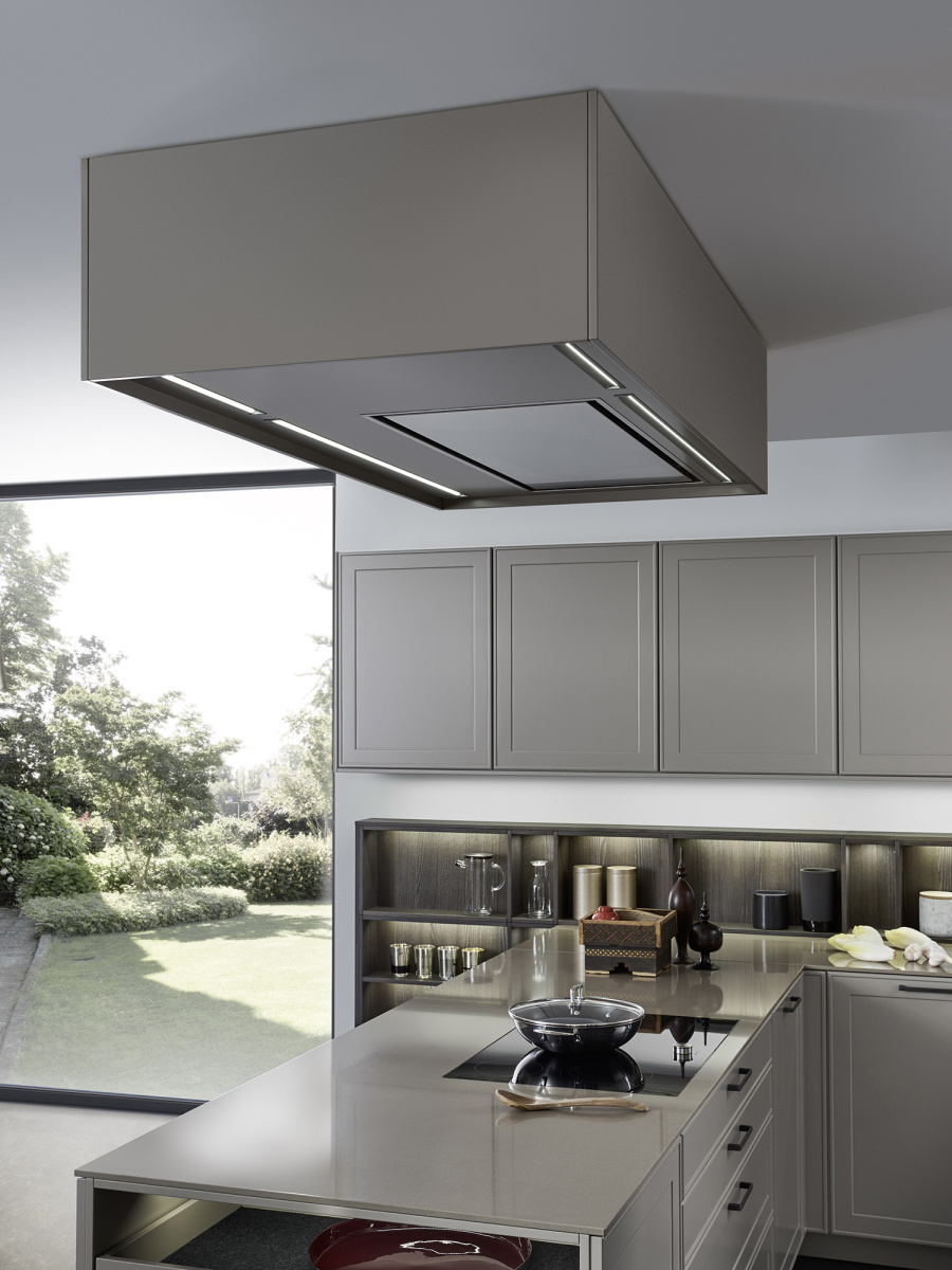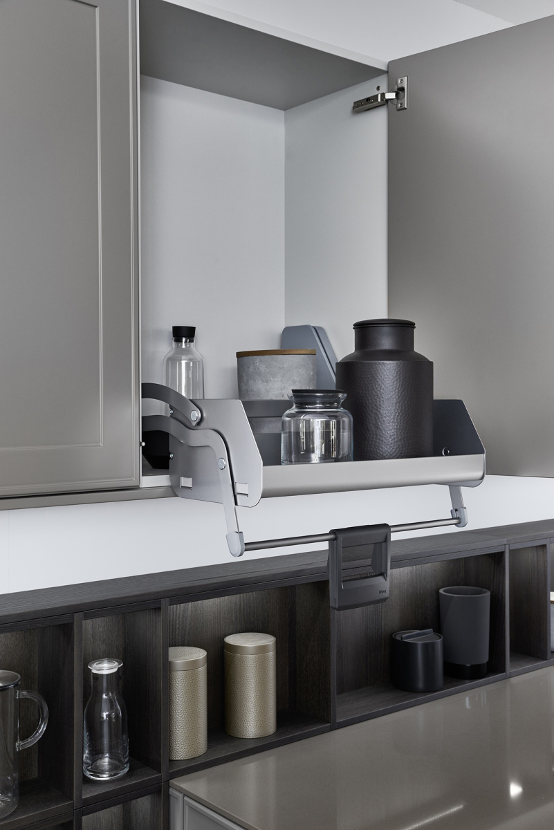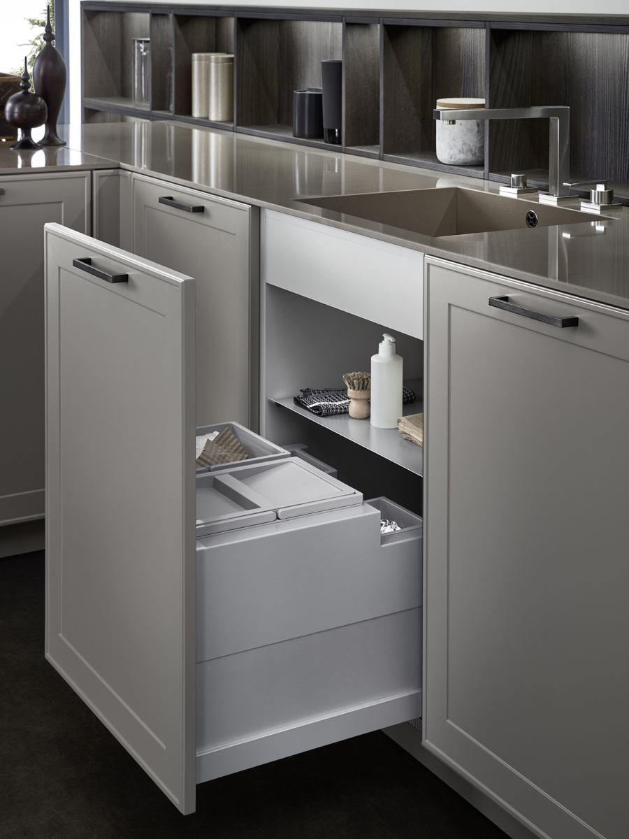 U ovom rešenju dominira kuhinjski front VERVE, sa karakterističnim frizom sa prednje strane u klasičnom stilu. Otvorene police su projektovane da daju lični pečat ovoj kuhinji i skladno su uklopljene kako po materijalu, tako i po boji. Nijansa UMBRA, iz ekskluzivne Le Corbusier kolekcije, donosi prirodnu toplinu, i savršeno se uklapa sa zidnim panelima i klupom od tamnog, fino obrađenog pravog drveta iz kolekcije TOPOS.