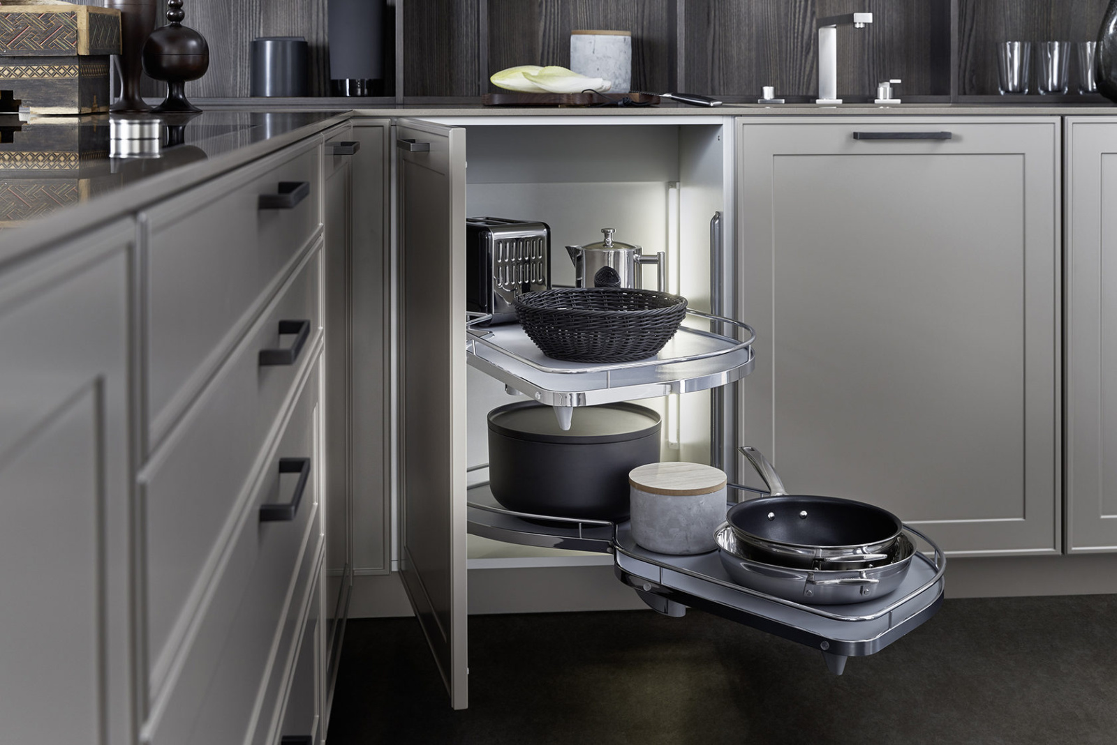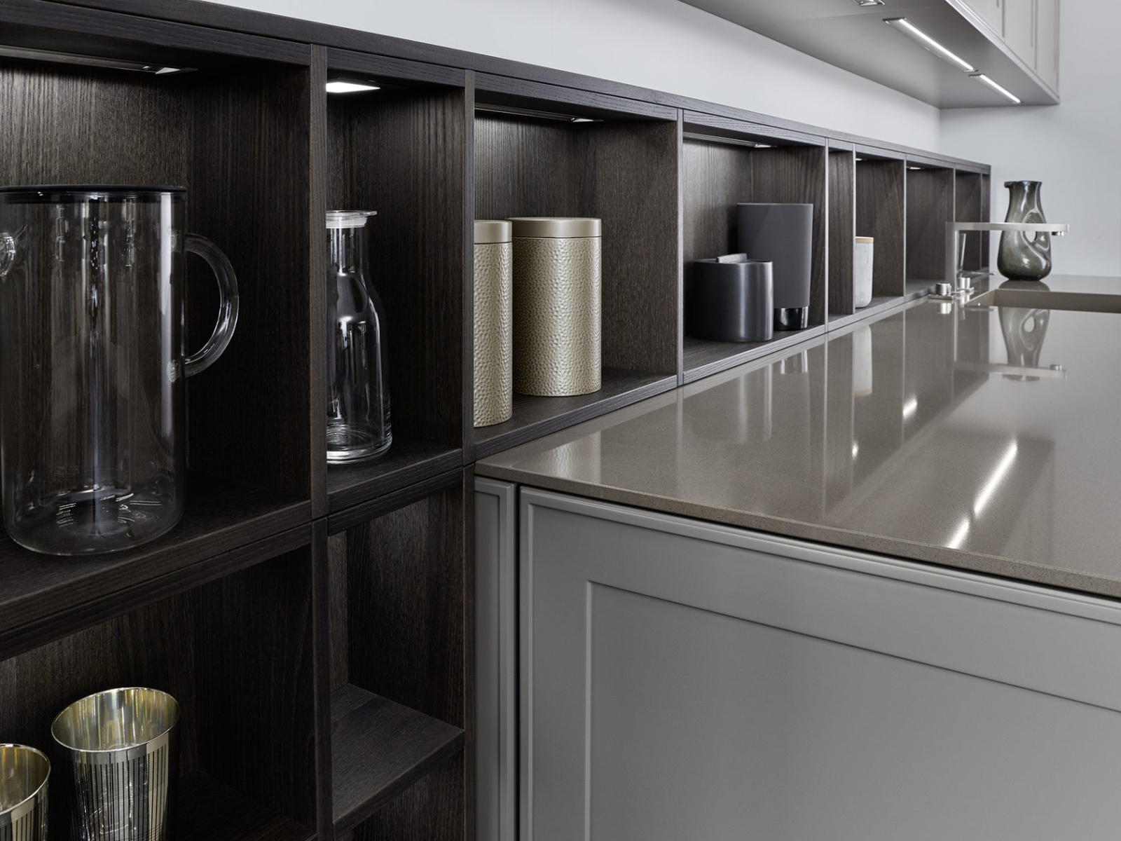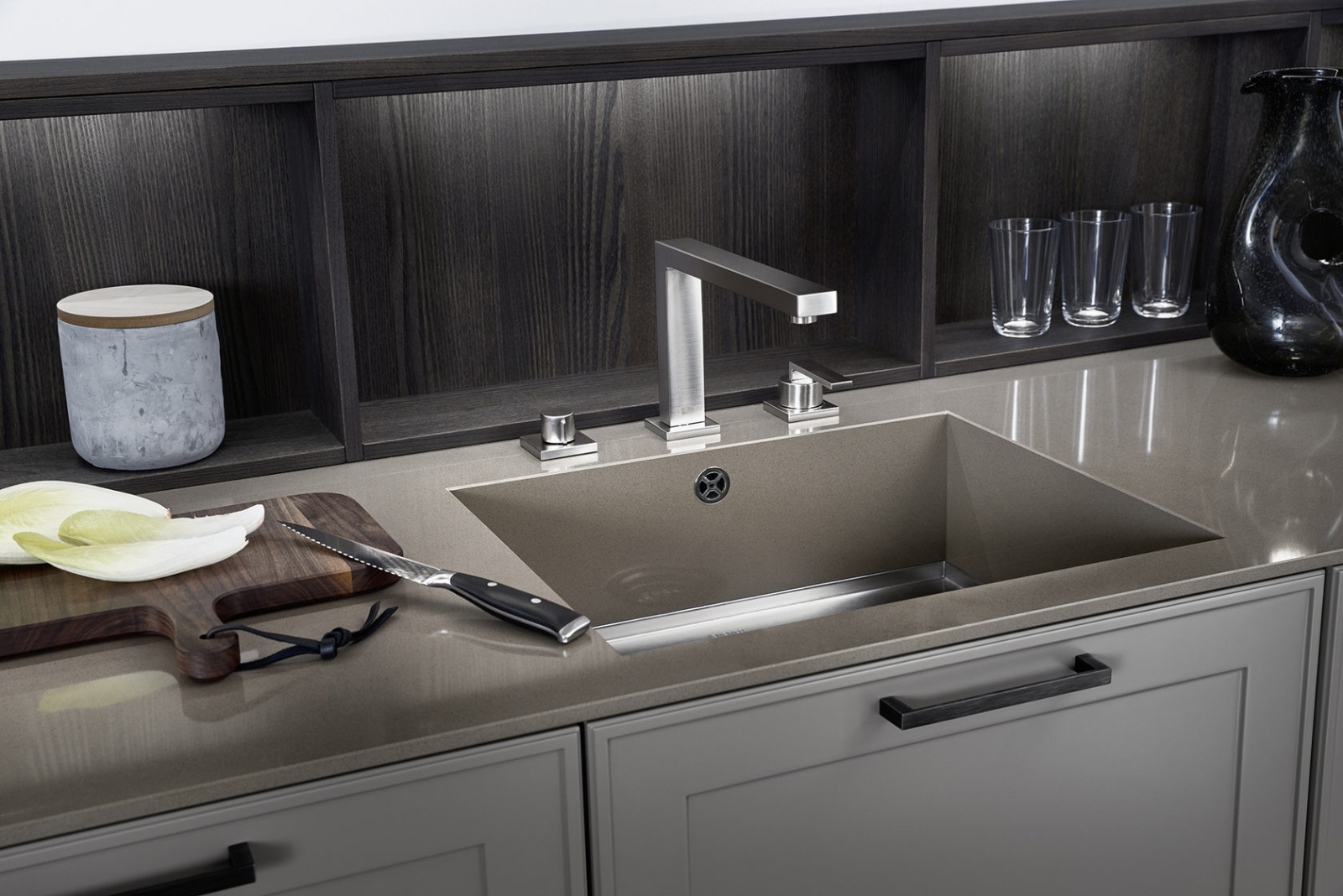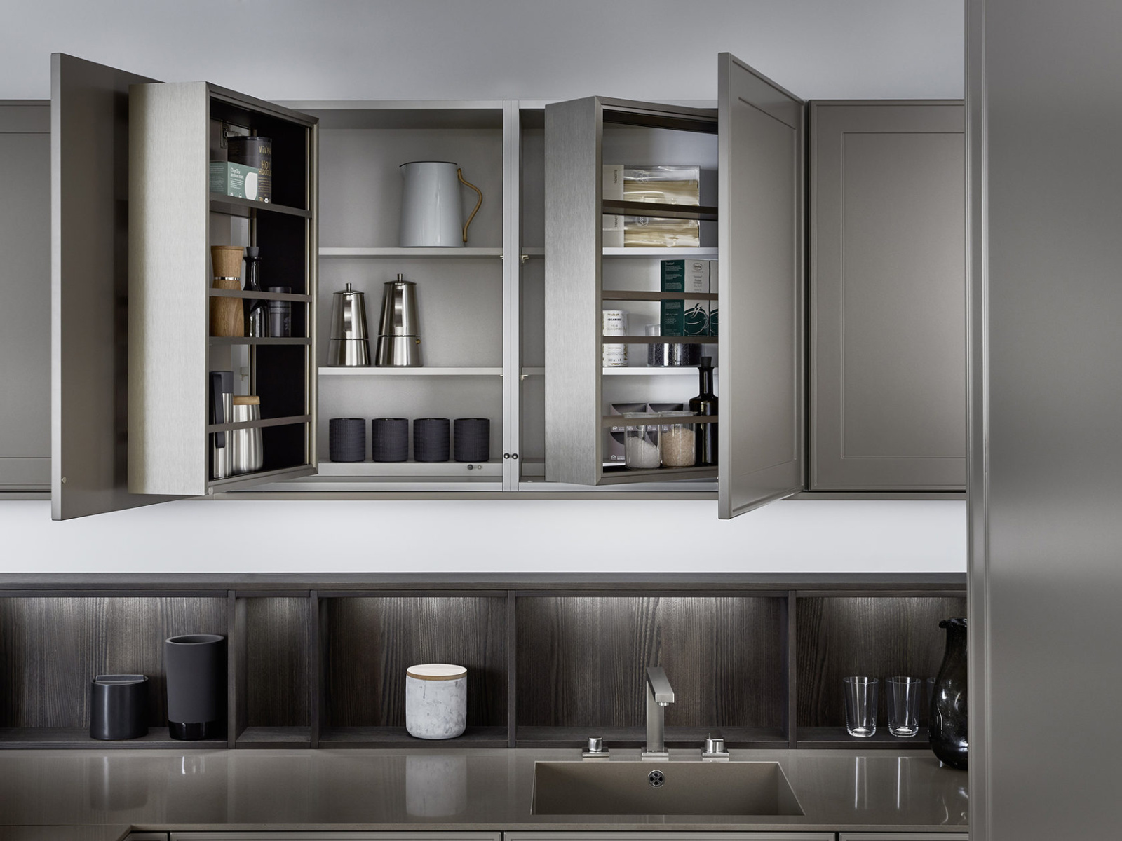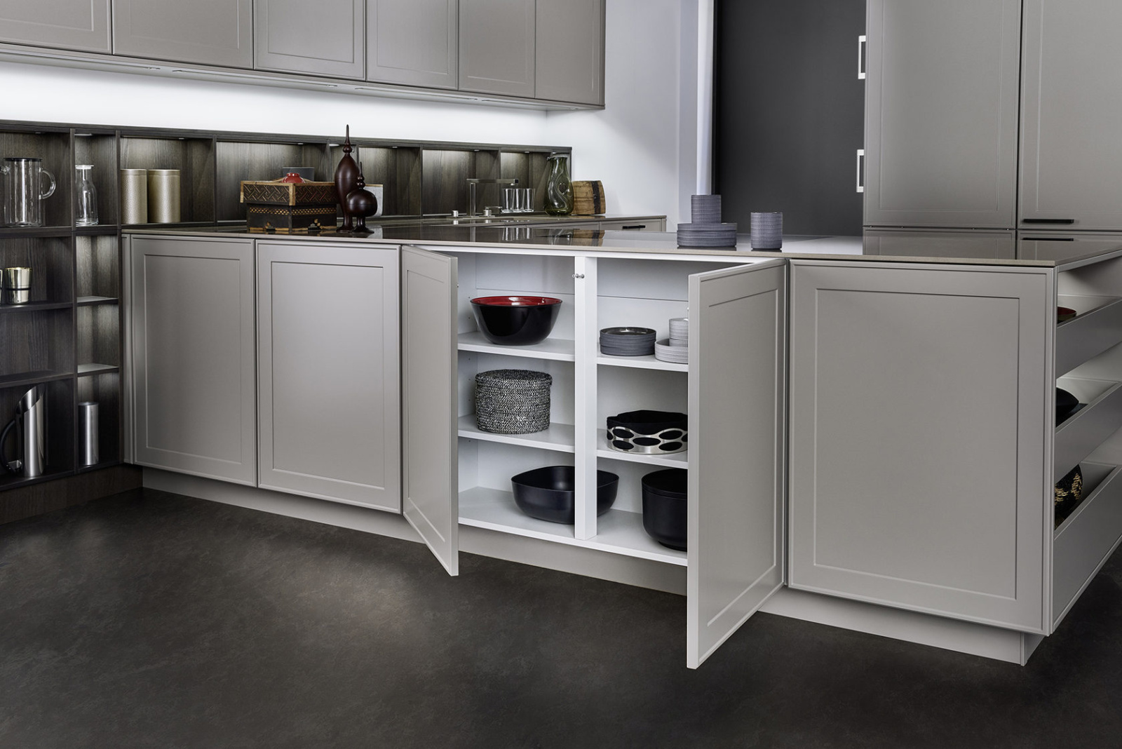 U ovom rešenju dominira kuhinjski front VERVE, sa karakterističnim frizom sa prednje strane u klasičnom stilu. Otvorene police su projektovane da daju lični pečat ovoj kuhinji i skladno su uklopljene kako po materijalu, tako i po boji. Nijansa UMBRA, iz ekskluzivne Le Corbusier kolekcije, donosi prirodnu toplinu, i savršeno se uklapa sa zidnim panelima i klupom od tamnog, fino obrađenog pravog drveta iz kolekcije TOPOS.
