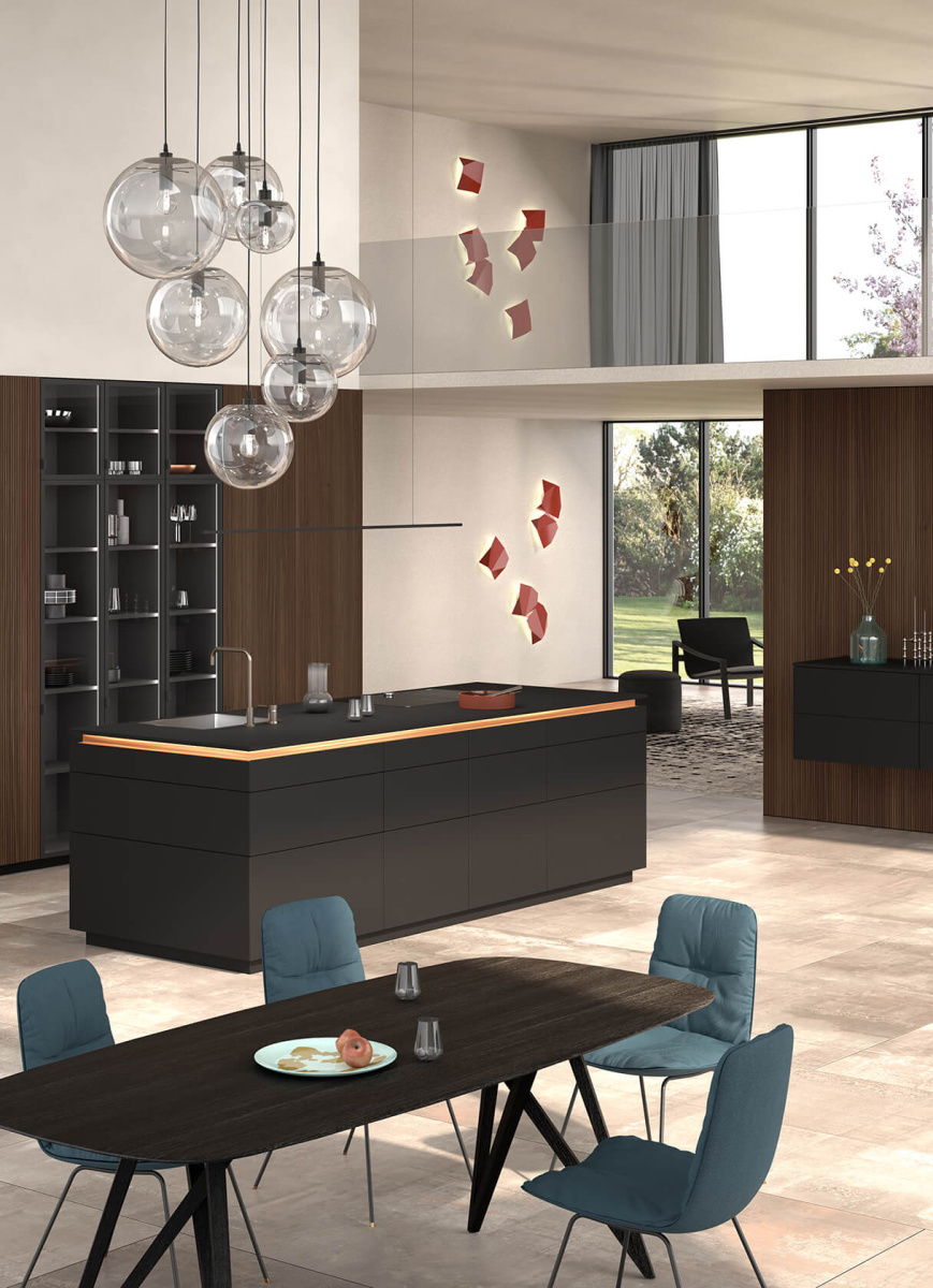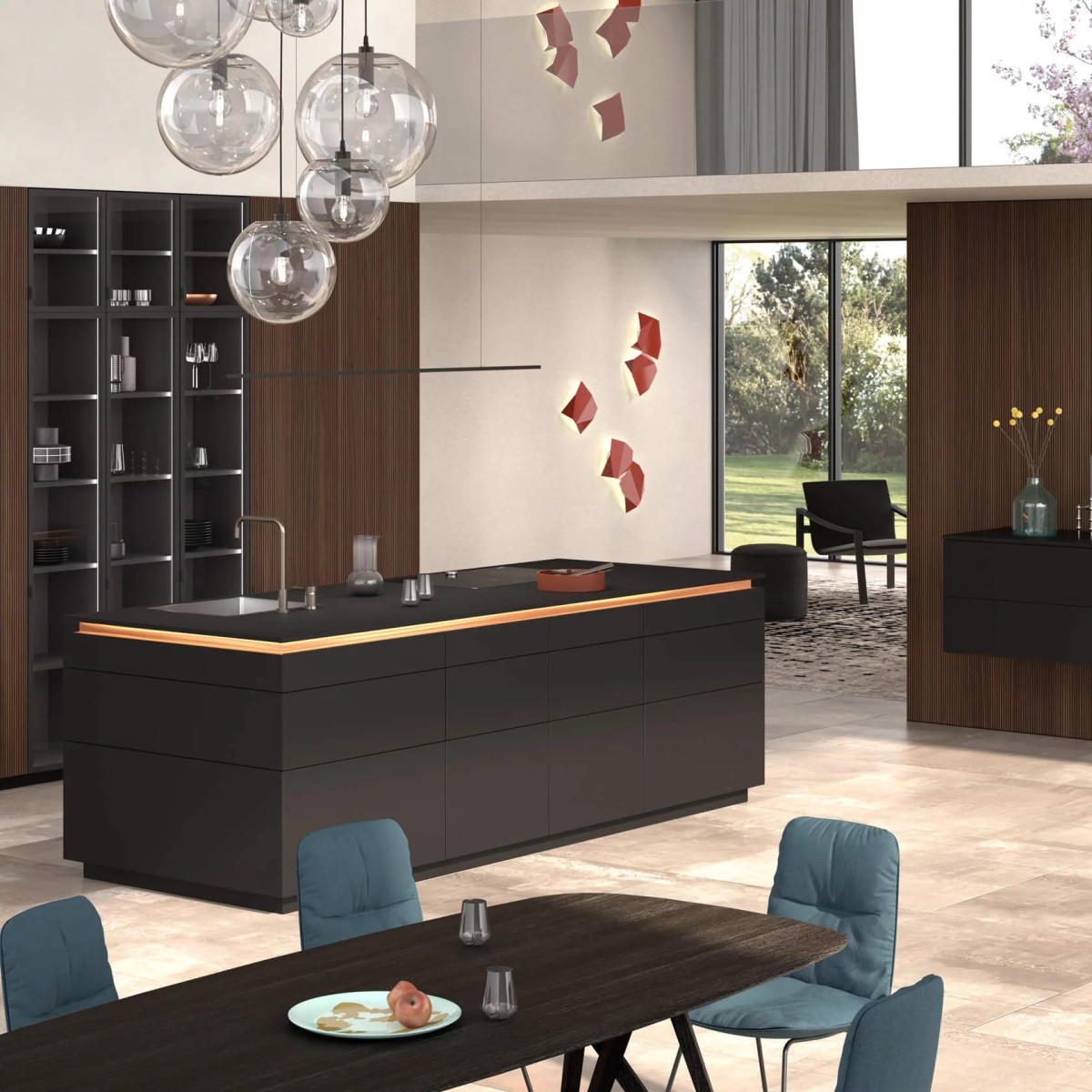 Poseban vizuelni akcenat čine VERO vitrine – stakleni ormari sa finim crnim čeličnim ramovima i integrisanom LED rasvetom, koje prostoru dodaju dozu luksuza. Vitrine su dostupne u tri ekskluzivne boje: srebrnoj, bakarnoj i crnoj, sa kombinacijom drvenih i staklenih polica, kao i sa držačima za čaše i boce – idealne za ljubitelje vina i elegancije.