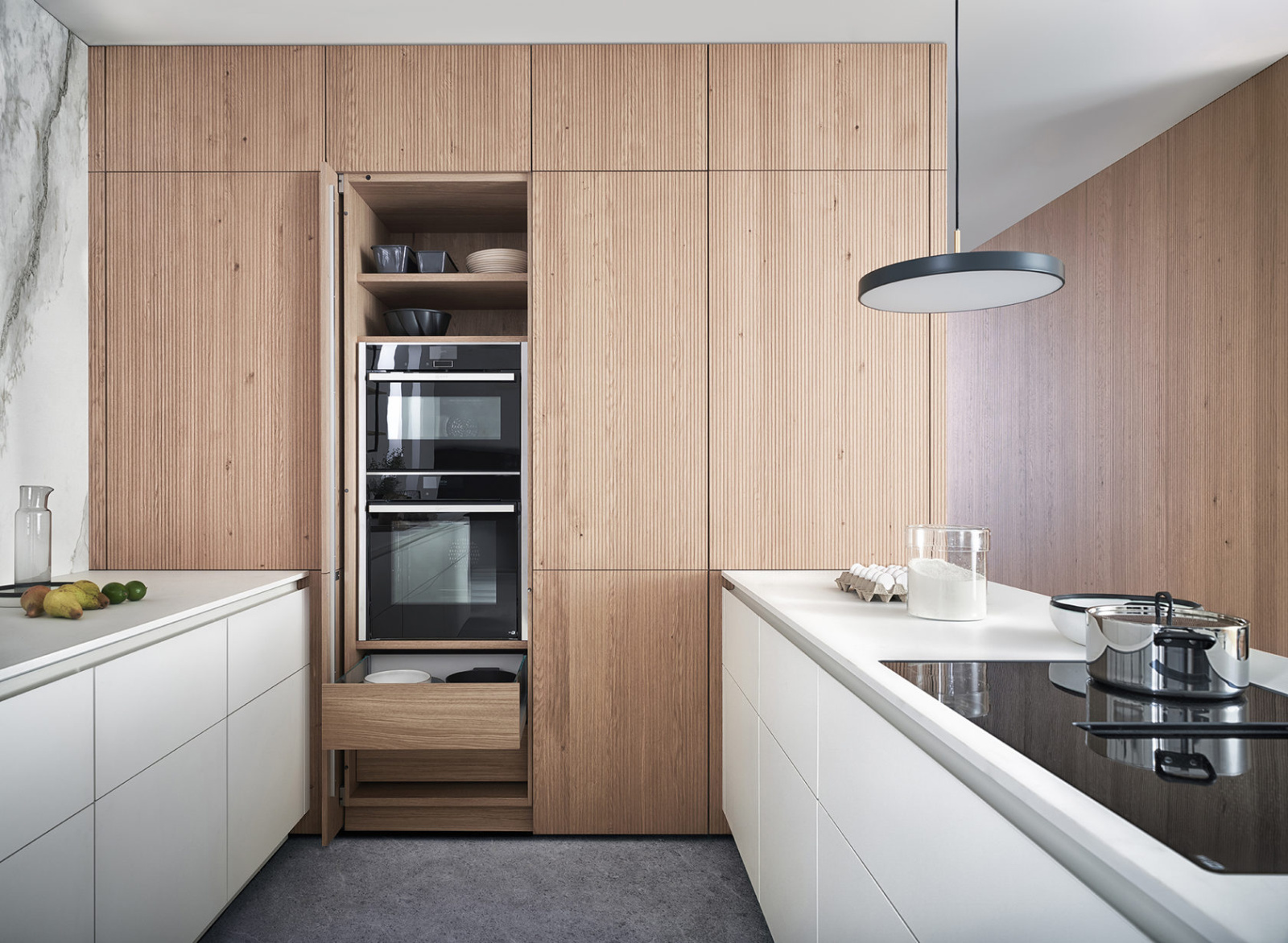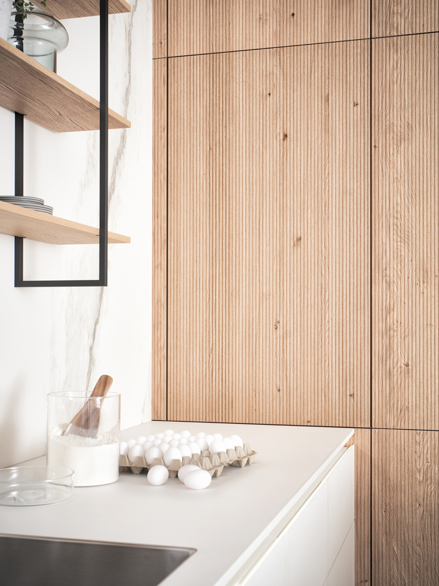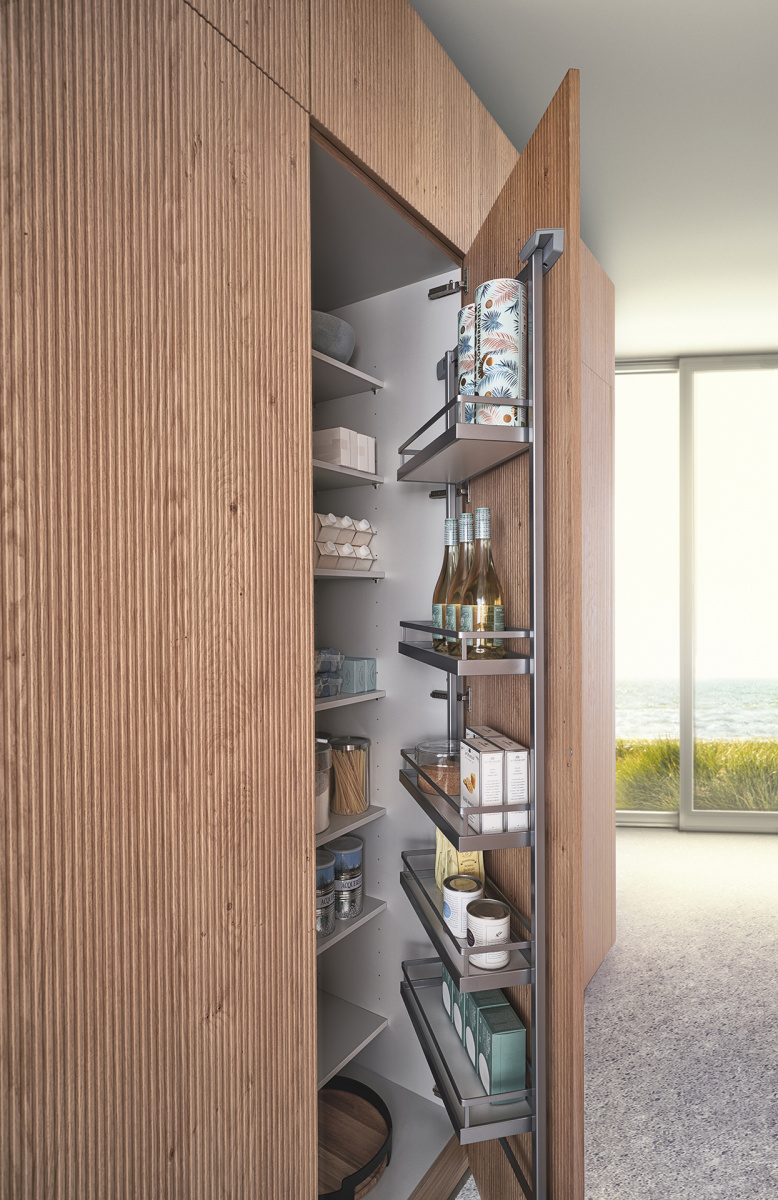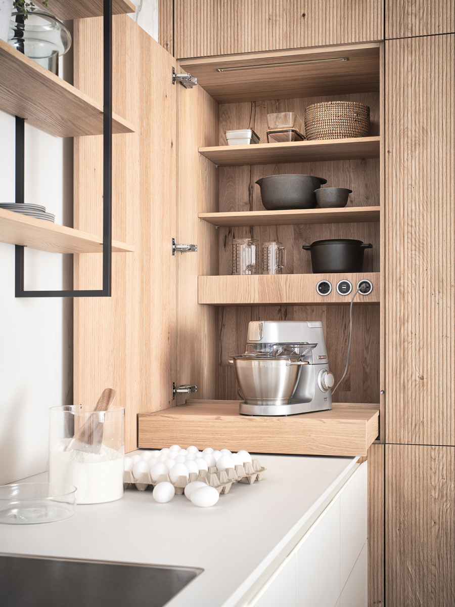 Još jedna prednost ove kuhinje jeste ugradni ormarić sa izvlačnom policom, koji pruža jednostavan pristup sadržaju, bez narušavanja estetike prostora. U zavisnosti od potreba i stila enterijera, ormarić je dostupan u više varijanti: