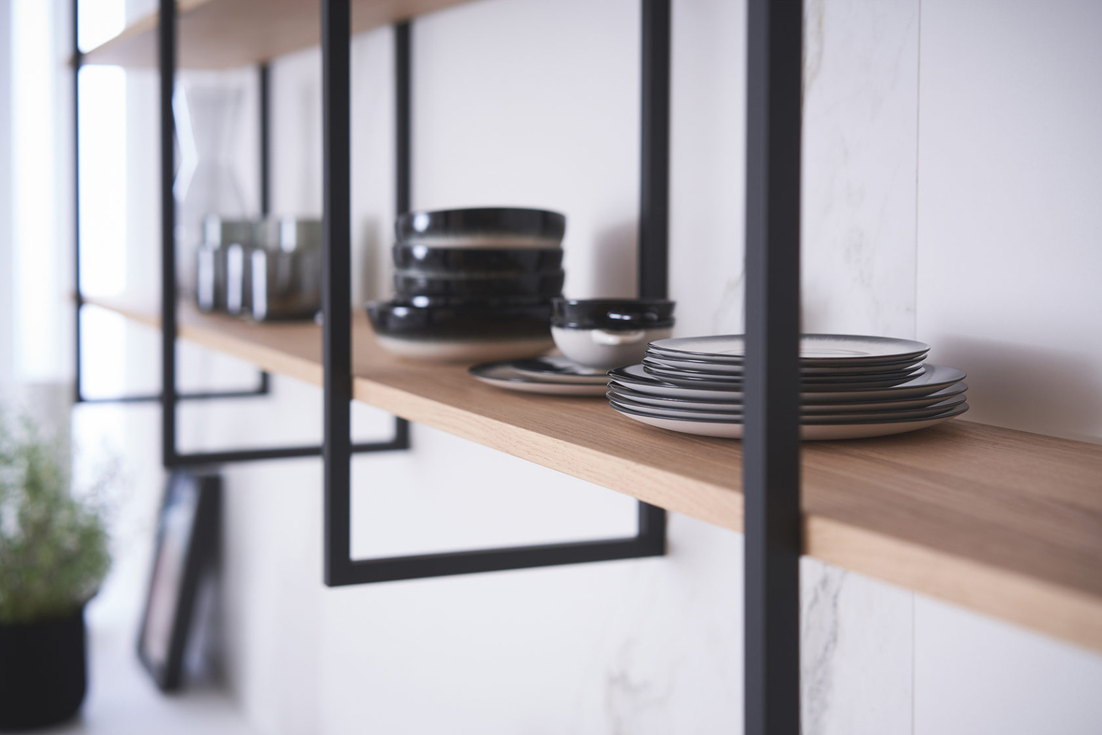 FIOS je dekorativni i modularni sistem polica iz LEICHT-a, namenjen za kuhinje, dnevne boravke, hodnike, pa čak i garderobe. Osmišljen je kao minimalistički okvir koji istovremeno ima čvrstu konstrukciju. Sistem se sastoji od vertikalnih metalnih ramova sa praškasto lakiranom završnom obradom i čvrstih polica koje su dostupne u gotovo svim varijantama površinskih obrada – od melamina, prirodnog drveta, mat i sjajnih lakova, pa sve do betonskih površina.