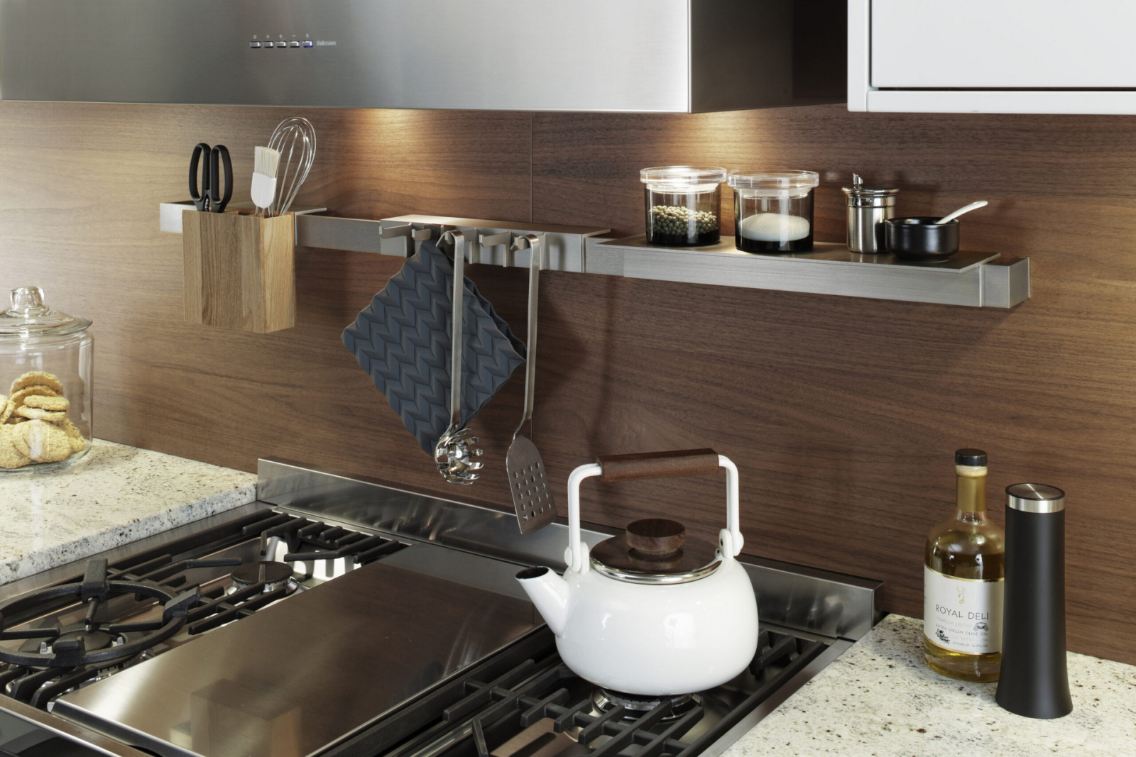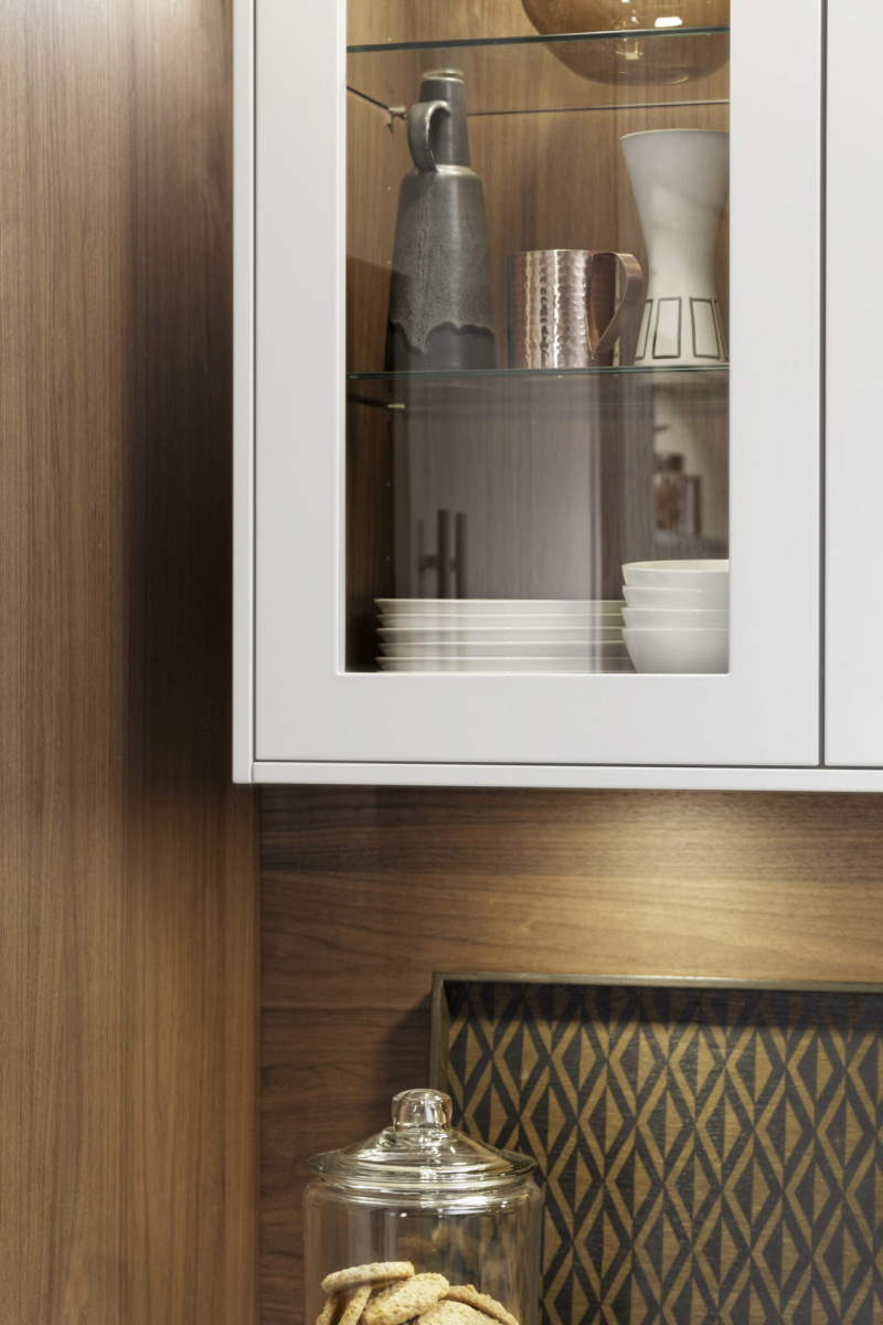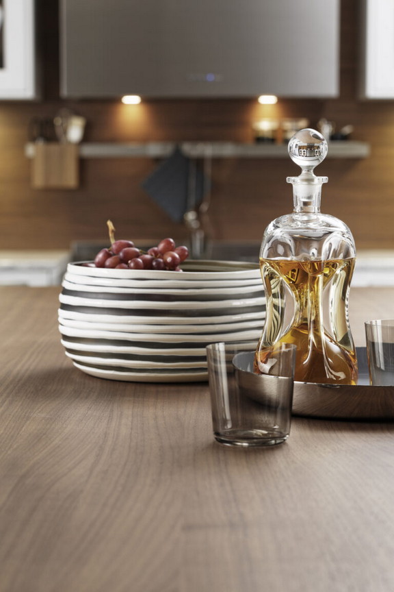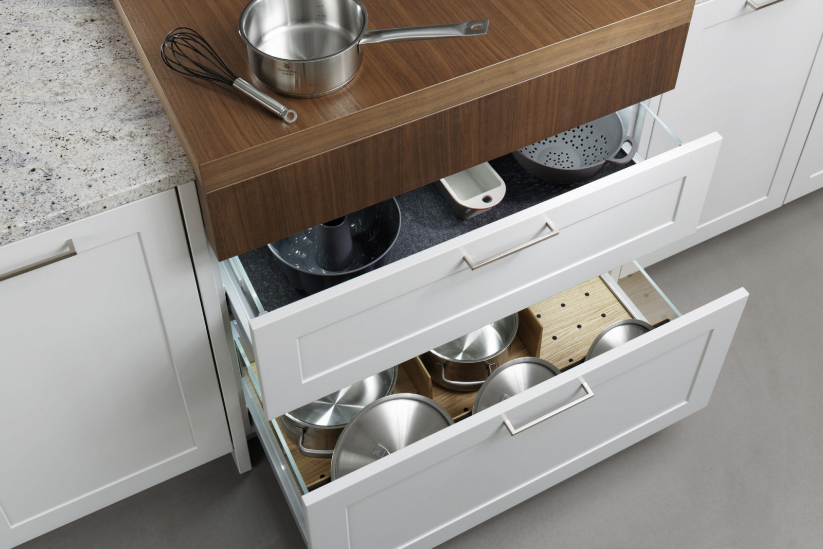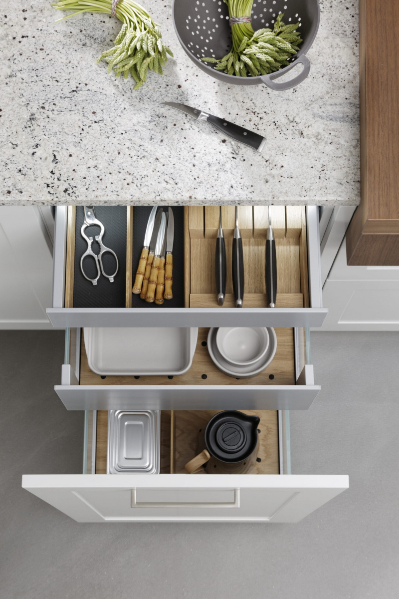 Kuhinja se dopada poznavaocima i ljubiteljima vrhunskih enterijera. Ono što volite je prikazano. Prostrani frižider za vino, integrisan u kontinuirani visoki blok jedinica, u kojem se takođe nalazi frižider, iako to nije očigledno spolja. Ova velika, neprekidna vrata su izuzetno elegantna i jedna su od mnogih mogućnosti izražavanja savoir-vivre. Ako će se kuhinja često koristiti, neophodna su lako dostupna rešenja za skladištenje: jedinice, izvlake i fioke u kojima je sav pribor uvek pri ruci i uredno spremljen. Klaser za escajg L-box od hrasta omogućava bolju organizaciju fioke. U zavisnosti od dimenzije i namene upotrebe postoji nekoliko opcija za klaser za escajg. l U isto vreme na dohvat ruke na zidnoj oblozi kuhinje ima još jedno efikasno rešenje za organizaciju prostora- sistem Domo – na šinu od 30 do 300cm možete da zakačite policu, kukice,držač za noževe, za začine, stalak za tablet i odlaganje malih uređaja.