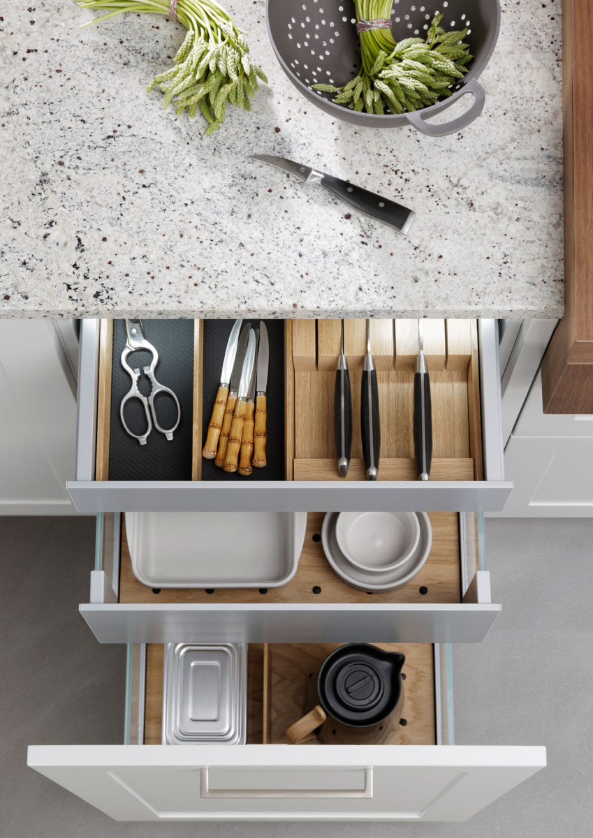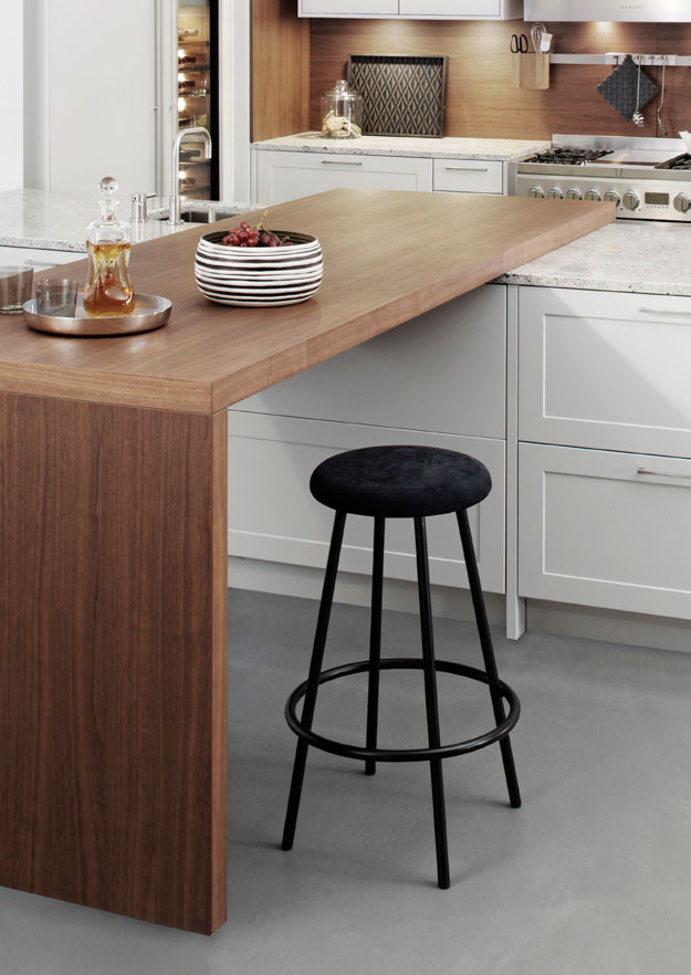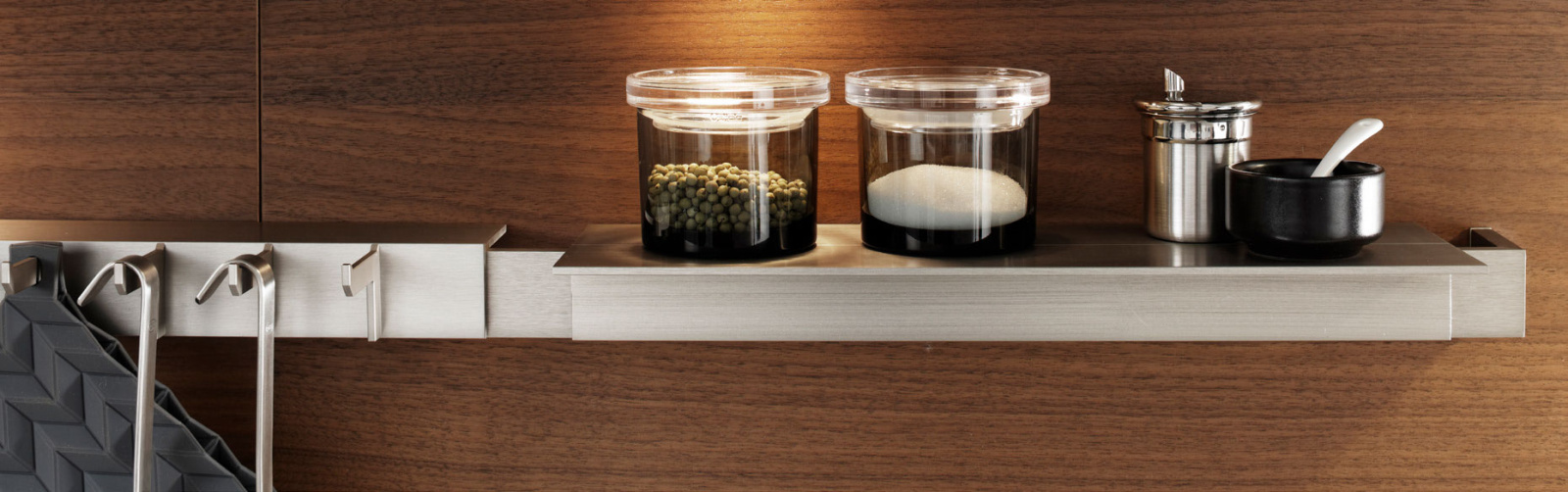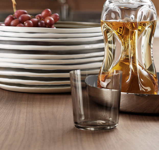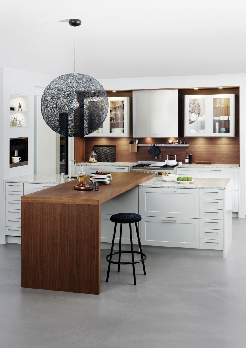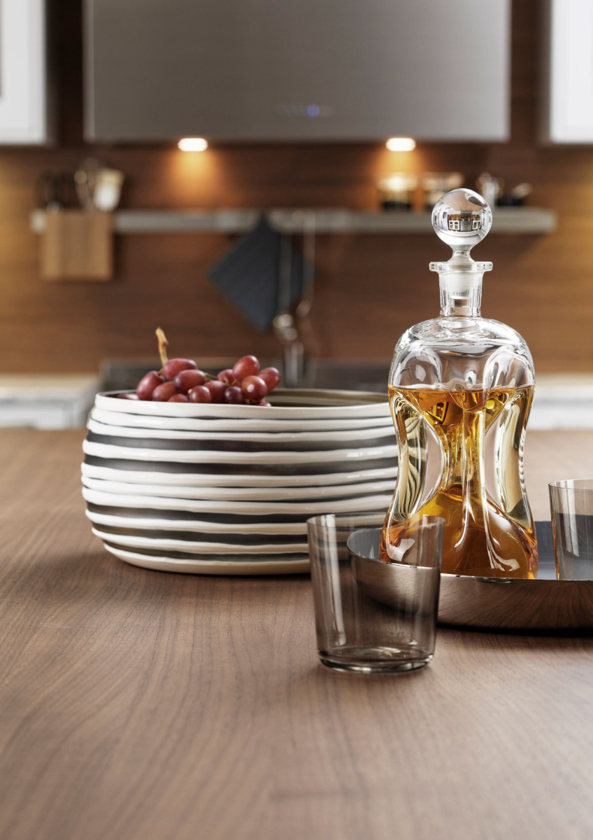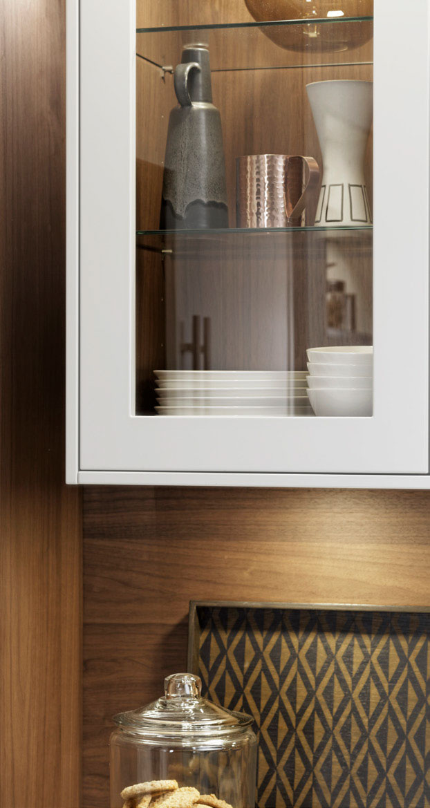 Dok obrada kuhinjskih frontova u mat laku unosi osećaj svedenosti i čistote, topli tonovi orahovog drveta unose toplinu i prijatnost u prostor. Ovaj zanimljivi kontrast naročito dolazi do izražaja u staklenim zidnim kuhinjskim elementima jer je drveni furnir vidljiv i sa unutrašnje strane te se posebno naglašava njegova lepota, kao prirodnog materijala.