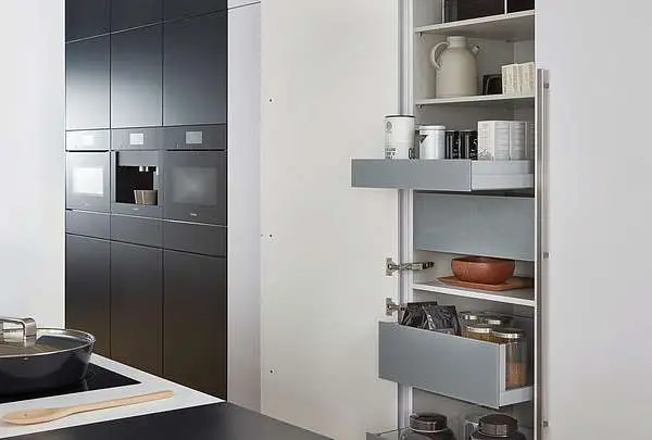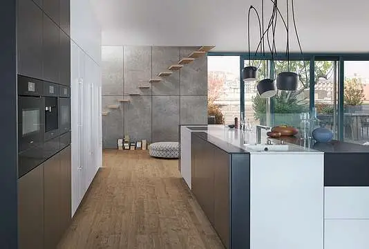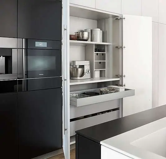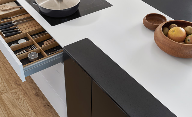 Kombinacija klasične crne i bele boje daje ovoj kuhinji vanvremensku eleganciju, dok frontovi izrađeni od visokokvalitetnog mat laka otpornog na otiske prstiju čine celokupan izgled sofisticiranim i praktičnim za svakodnevnu upotrebu.