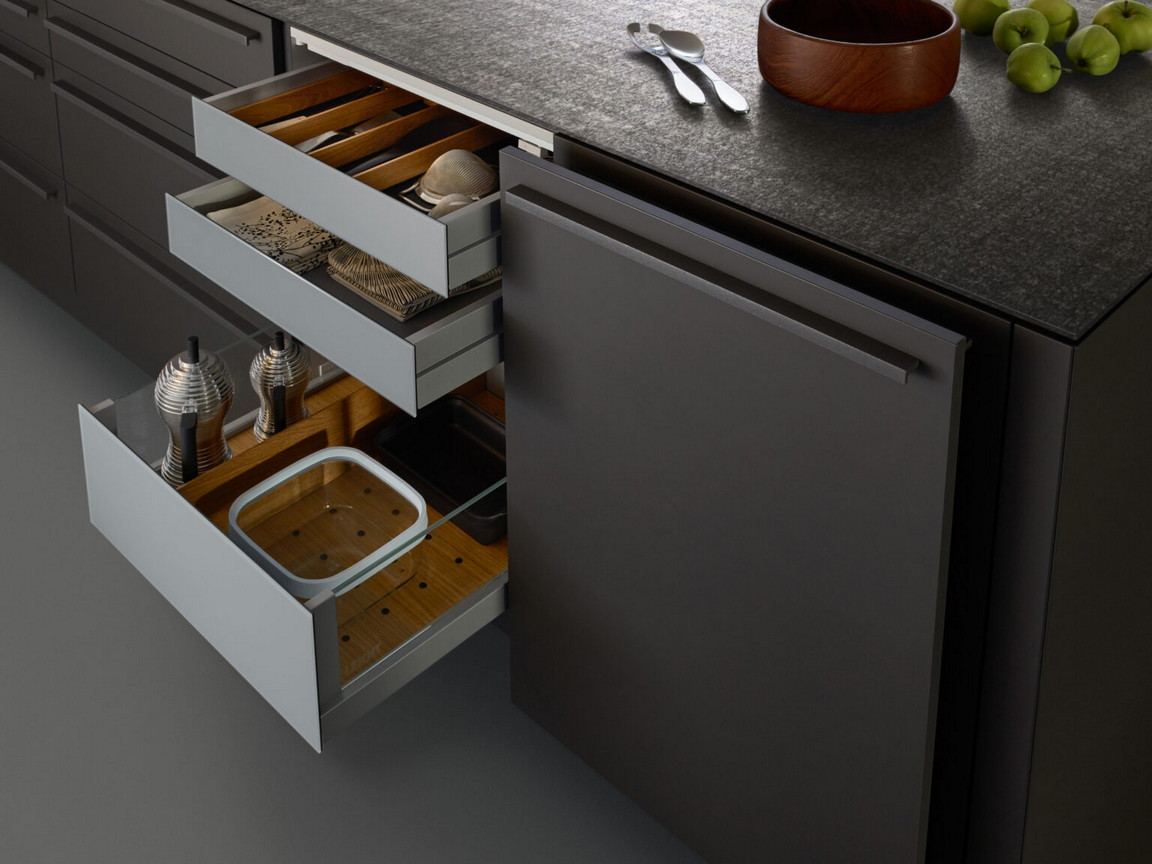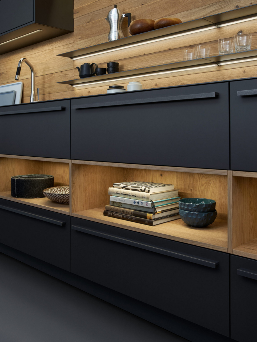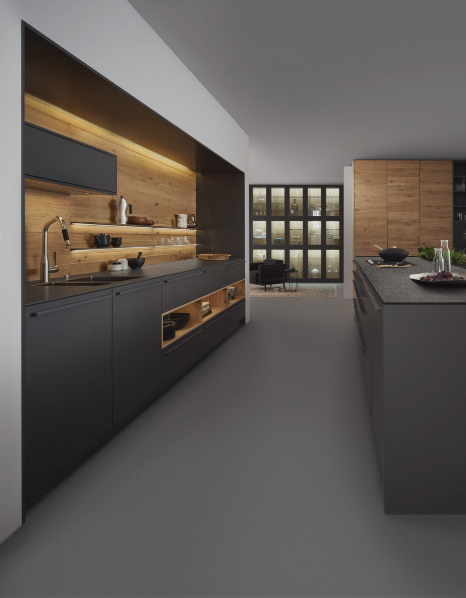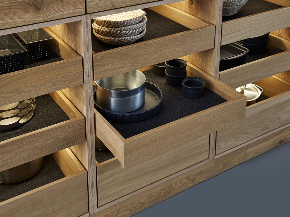 Neprekidni frontovi koji se menjaju sa diskretno osvetljenim vitrinama i otvorenim policama. Prava je radost istražiti unutrašnje funkcionisanje sa umecima i pregradama od visokokvalitetnog pravog drveta, olakšavaju održavanje stvari.