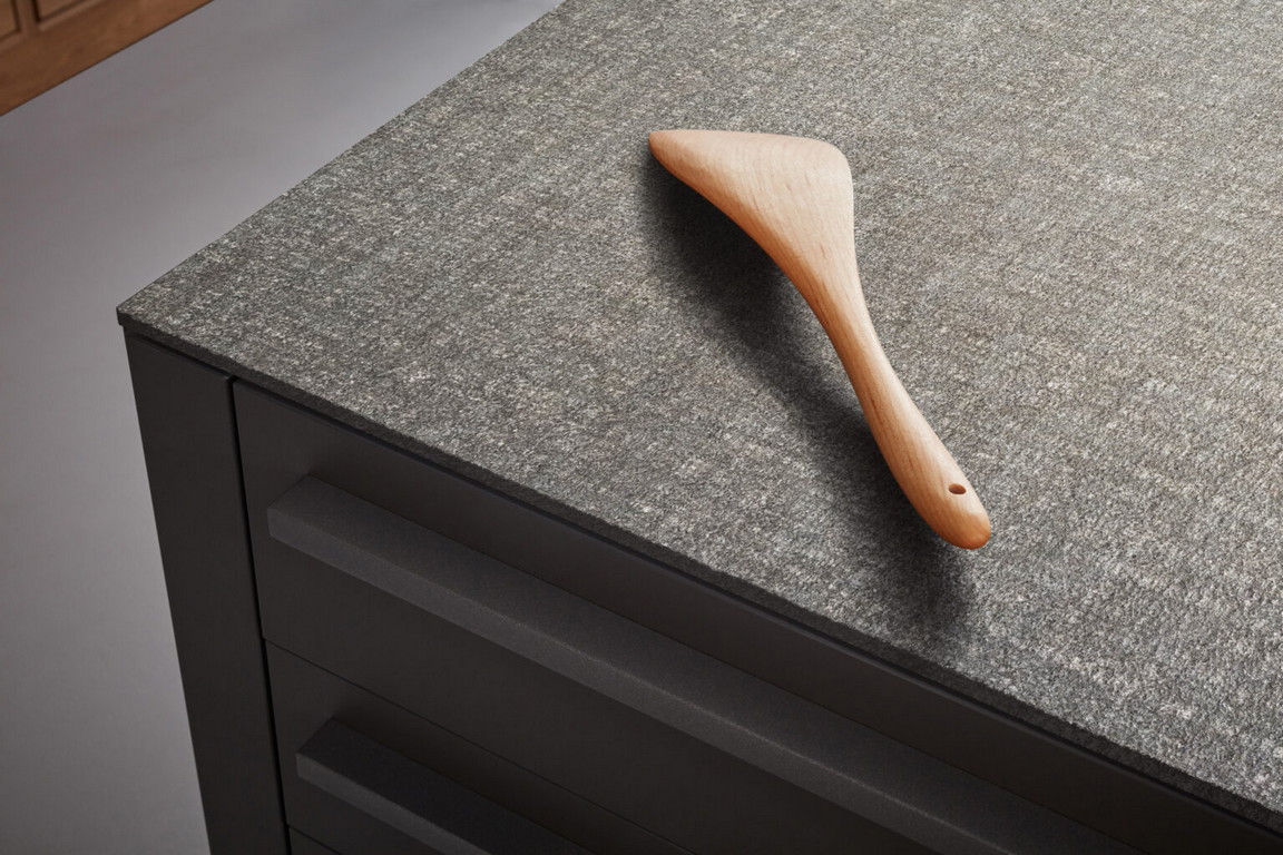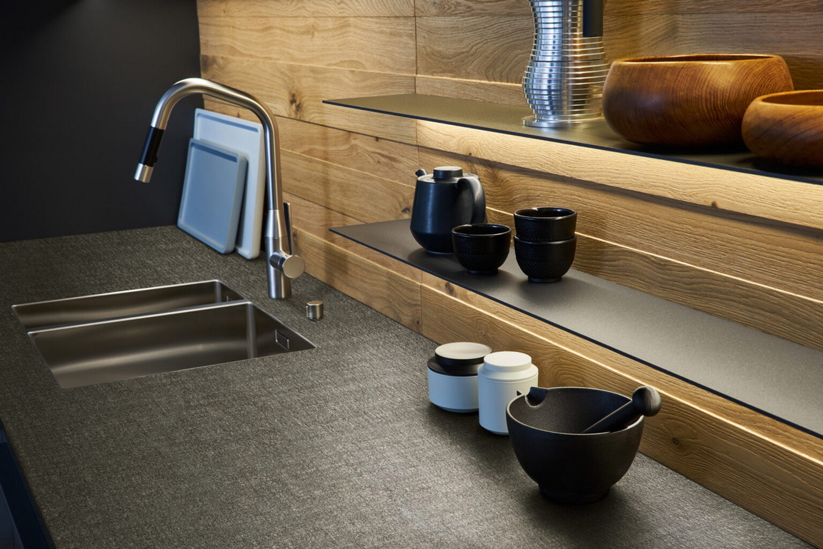 Sto i zidna obloga urađeni sa radnom pločom su od istog materijala, kao i fasada Valais, što stvara harmoniju u setu kuhinja-ostrvo-visoki ormari.