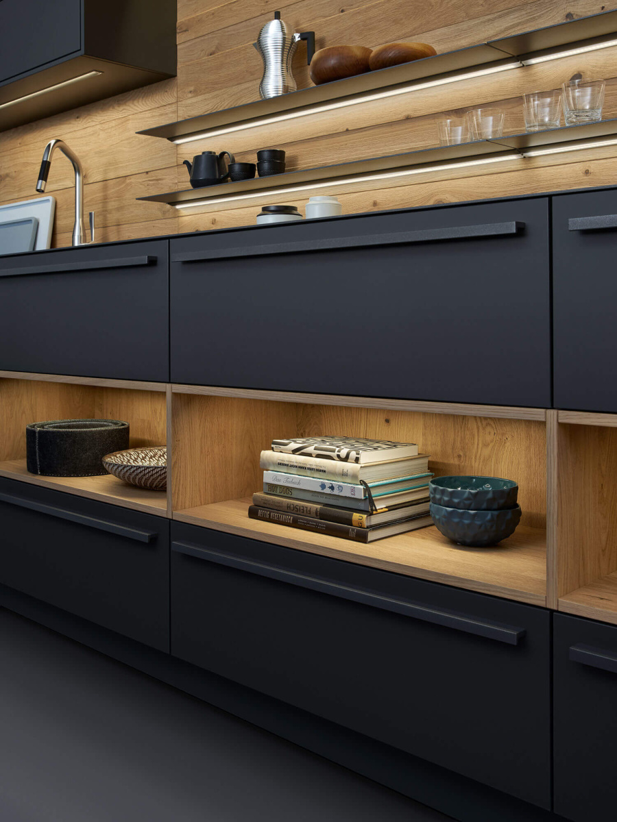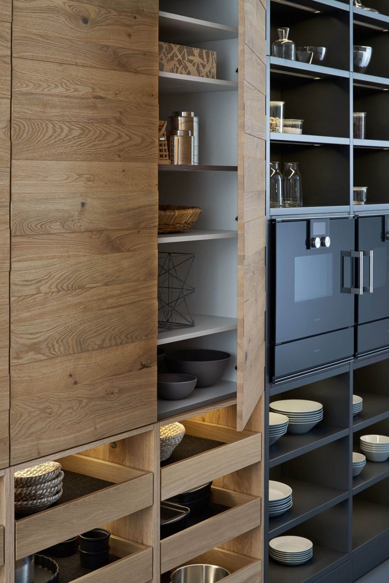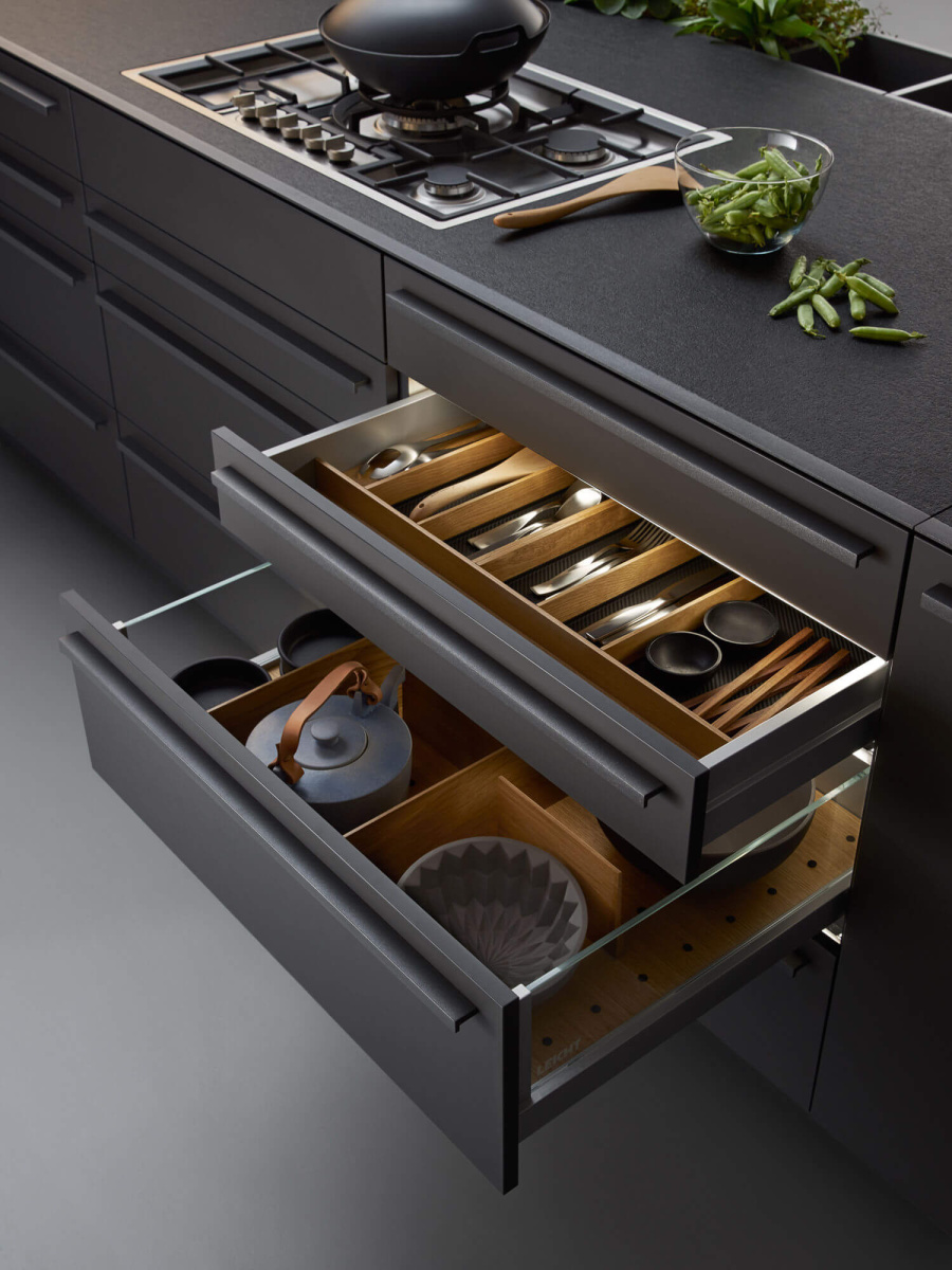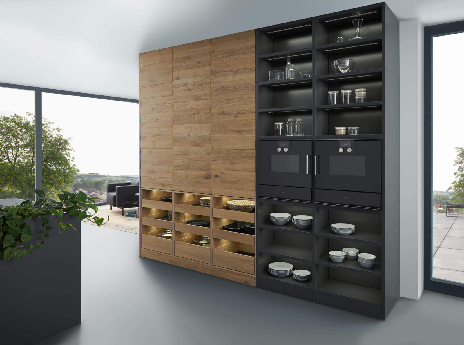 Elegantna celina visokih kuhinjskih elemenata odiše smirenošću i prefinjenošću. Neprekinuti frontovi se skladno smenjuju sa diskretno osvetljenim vitrinama i otvorenim policama, stvarajući ritam koji izaziva radoznalost. Unutrašnjost otkriva svet pažljivo osmišljenih detalja- umetci i pregrade od veoma kvalitetnog pravog drveta omogućavaju lako organizovanje prostora i urednost, čineći svaki predmet dostupnim i vidljivim.