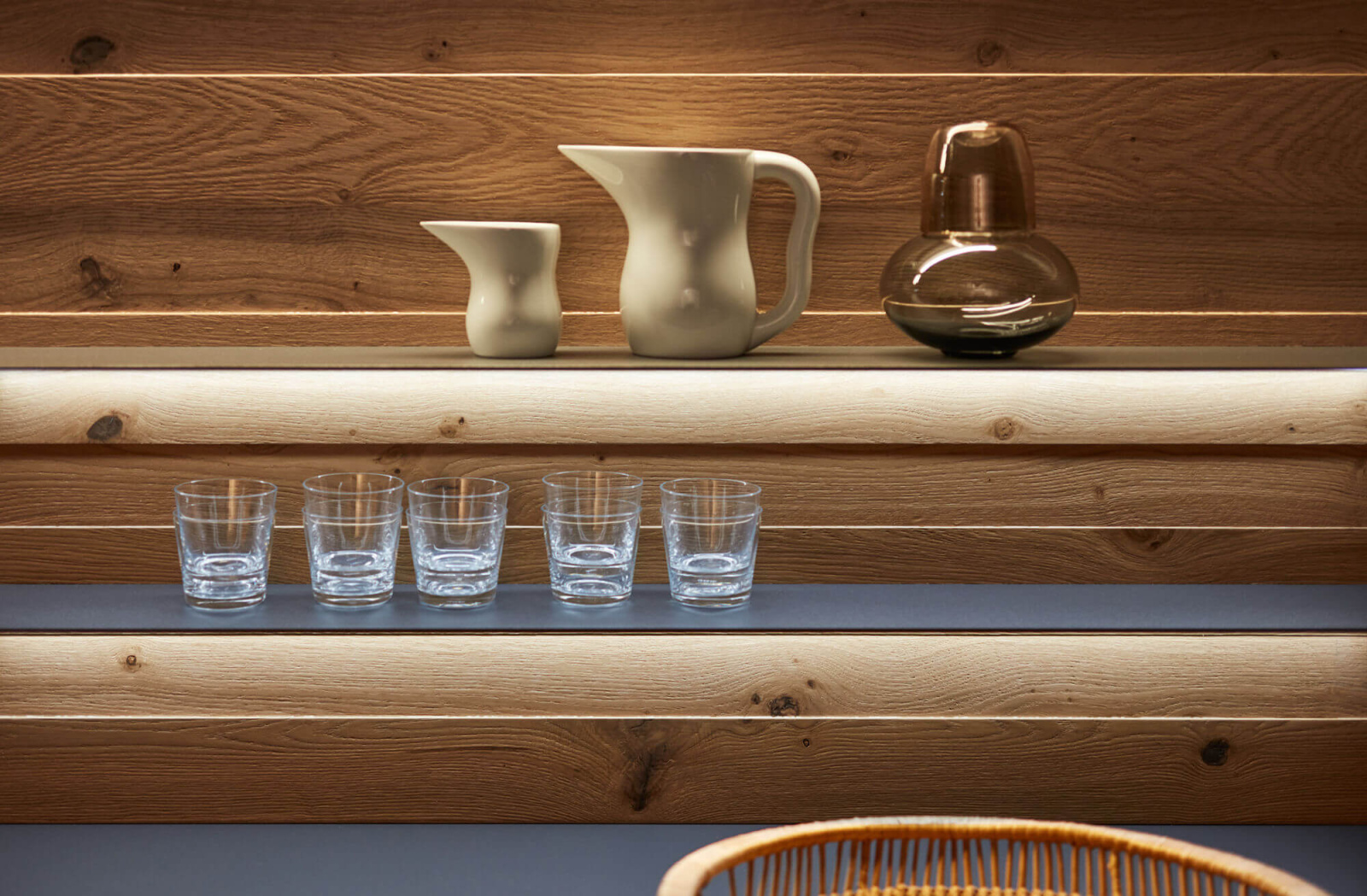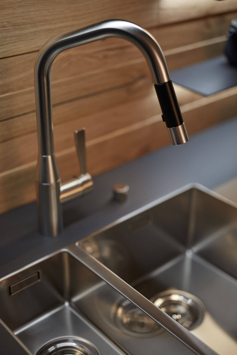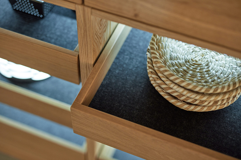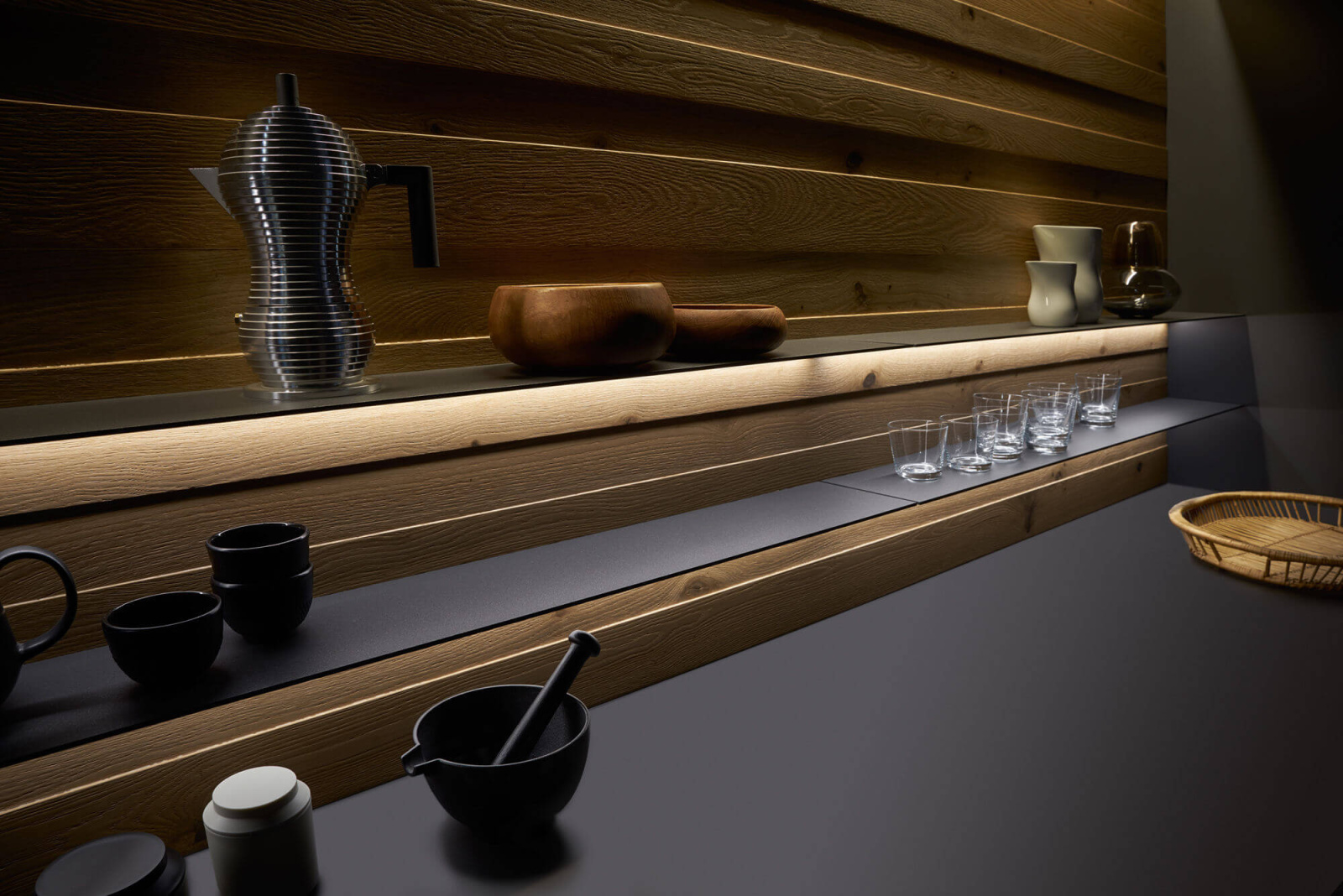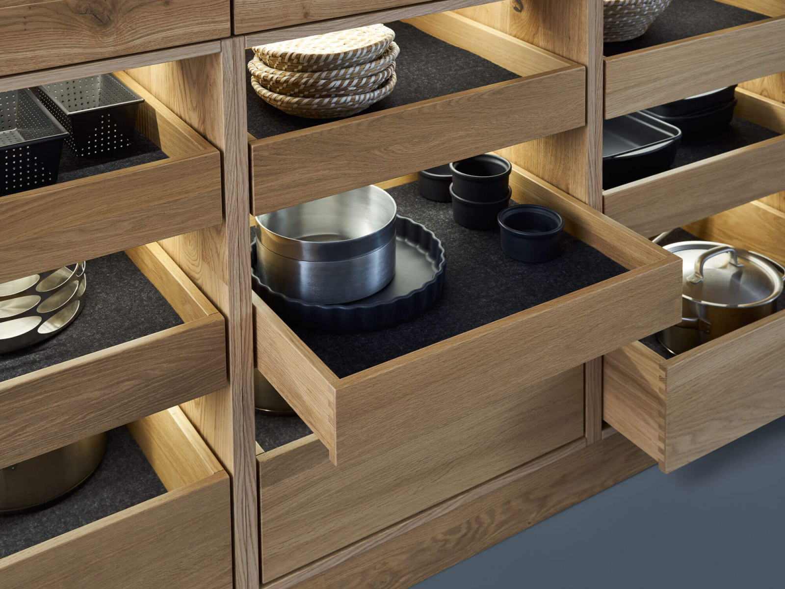 Elegantna celina visokih kuhinjskih elemenata odiše smirenošću i prefinjenošću. Neprekinuti frontovi se skladno smenjuju sa diskretno osvetljenim vitrinama i otvorenim policama, stvarajući ritam koji izaziva radoznalost. Unutrašnjost otkriva svet pažljivo osmišljenih detalja- umetci i pregrade od veoma kvalitetnog pravog drveta omogućavaju lako organizovanje prostora i urednost, čineći svaki predmet dostupnim i vidljivim.