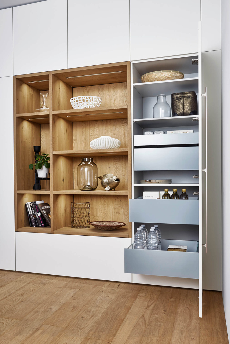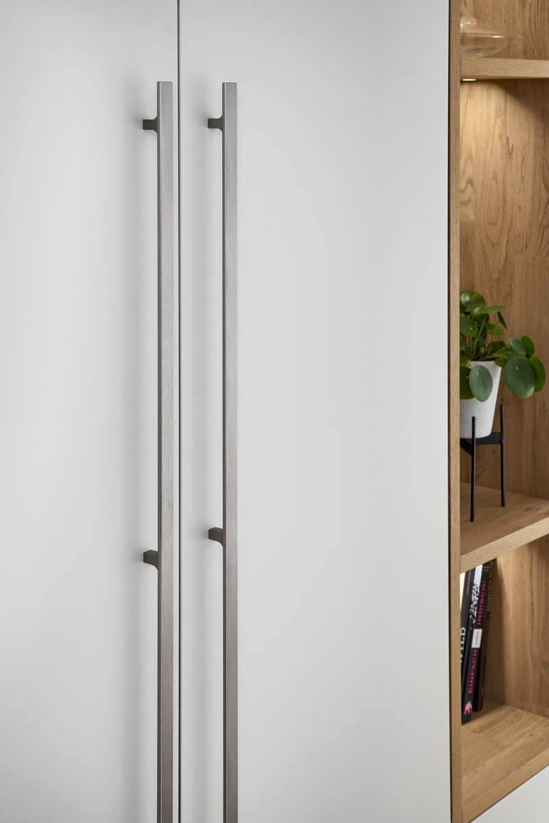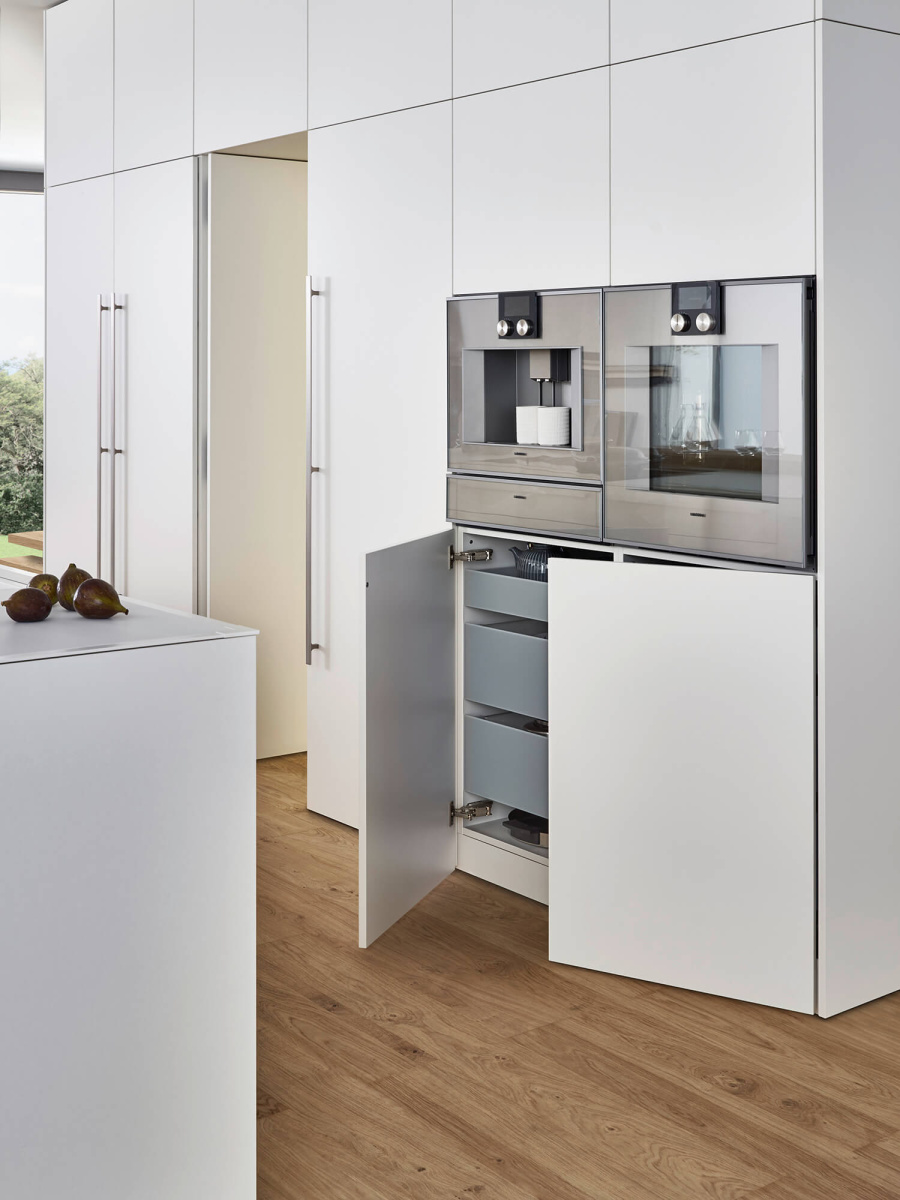 Uprkos svojoj vizuelnoj jednostavnosti, ova kuhinja ima dosta skrivenih elemenata koji utiču na funkcionalnost kuhinje. Kuhinjski elementi do plafona, ravne linije frontova i diskretne ručke su projektovani kako bi se prostor za unutrašnju organizaciju maksimalno iskoristio. Na ostrvu je primenjena poluintegrisana ručka u boji fronta, a radna ploča od inovativnog FENIX materijala iz EVO programa, sa vidljivom debljinom od samo 6 mm, pruža utisak jedinstvene površine ističući moderan dizajn bez prekinutih linija.