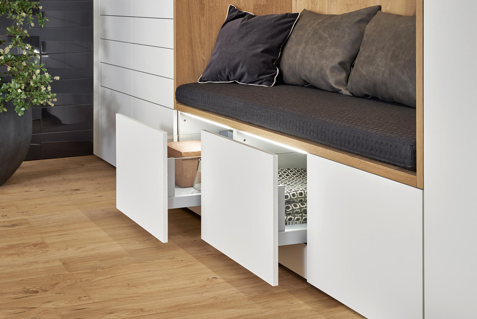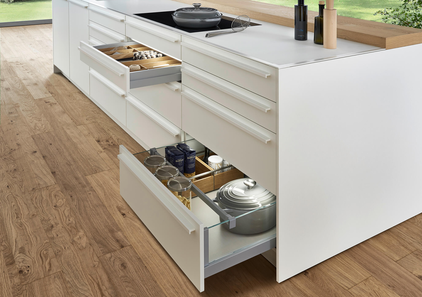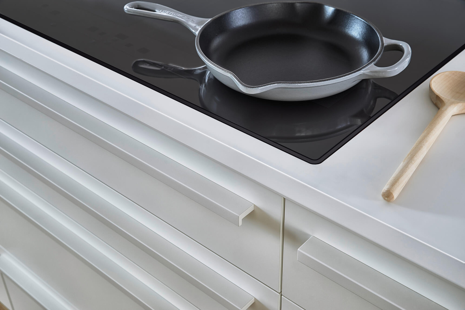 Uprkos svojoj vizuelnoj jednostavnosti, ova kuhinja ima dosta skrivenih elemenata koji utiču na funkcionalnost kuhinje. Kuhinjski elementi do plafona, ravne linije frontova i diskretne ručke su projektovani kako bi se prostor za unutrašnju organizaciju maksimalno iskoristio. Na ostrvu je primenjena poluintegrisana ručka u boji fronta, a radna ploča od inovativnog FENIX materijala iz EVO programa, sa vidljivom debljinom od samo 6 mm, pruža utisak jedinstvene površine ističući moderan dizajn bez prekinutih linija.