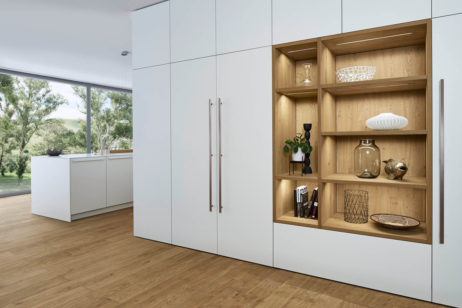 Toplu, domaću atmosferu dodatno naglašava pažljivo odabrana kombinacija materijala: mat lakirani frontovi BONDI u nežnoj beloj nijansi sa zaštitom protiv otisaka prstiju, u kontrastu sa bogatom teksturom prirodnog drveta TOPOS. Njegova izražena struktura, prirodna boja i postojanost donose karakter i dugovečnost – jer pravo drvo s godinama postaje još lepše.