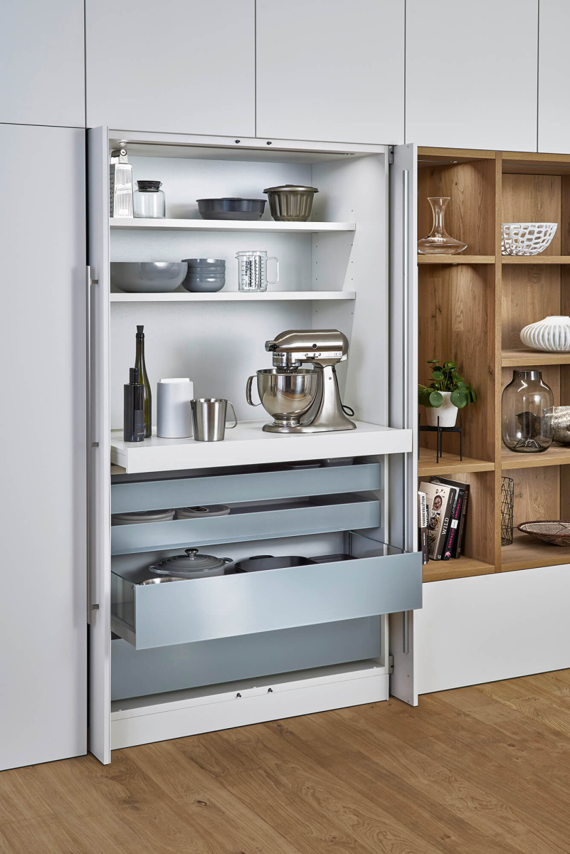 U kuhinju je integrisana bela tehnika prestižnog nemačkog brenda GAGGENAU, Serija 400, bez vidljivih ručki. Uređaji se otvaraju sistemom blagog pritiska, čime se dodatno naglašava čista linija frontova. Jedan od posebno funkcionalnih elemenata jeste „čajni ormar“ širine 90 cm, koji zahvaljujući izvlačnim policama donosi dodatnu radnu površinu i savršeno služi kao pomoćni prostor unutar kuhinje.