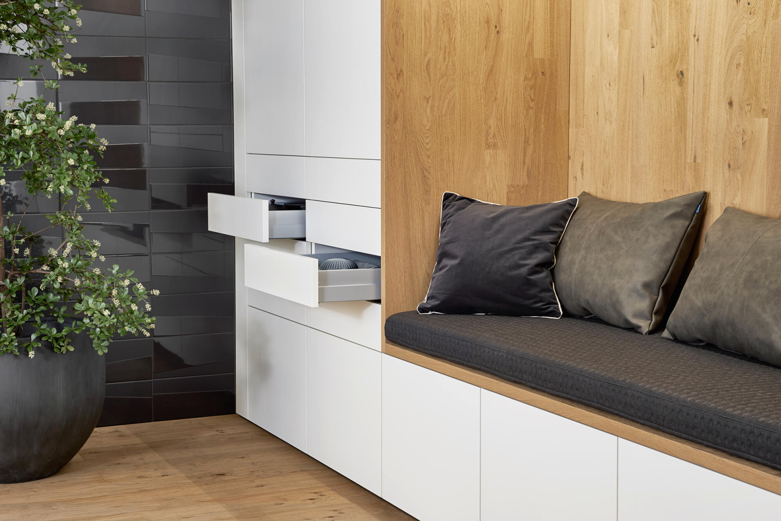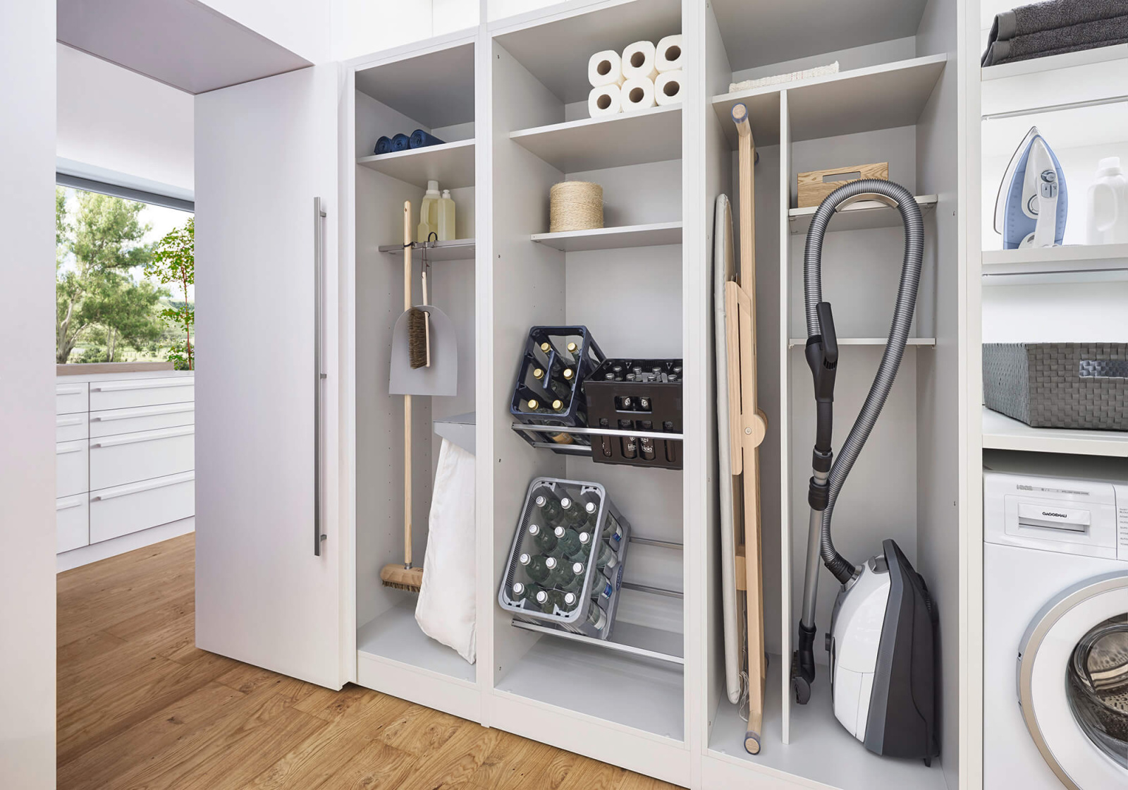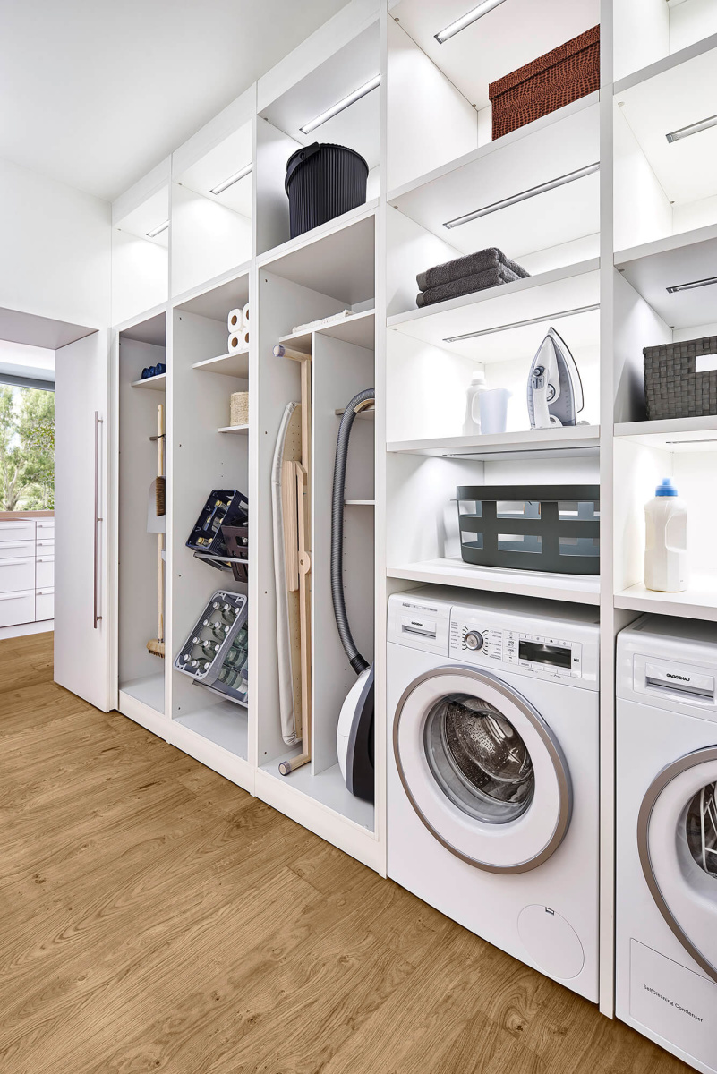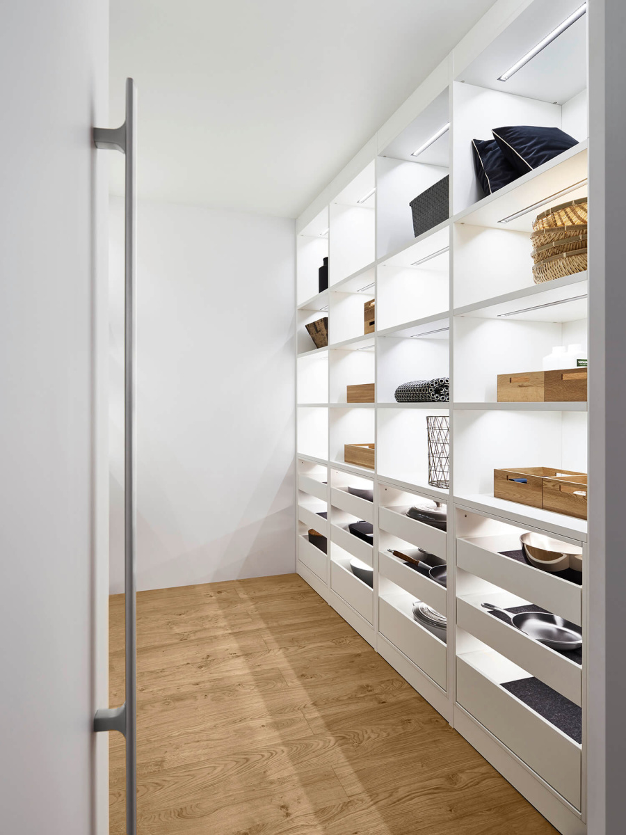Sve ono što ne treba da bude vidljivo - garderober, vešernica i ostava za namirnice - vešto je skriveno iza naizgled jedinstvenog i ravnog fronta. Kao rešenje kreirana je kompaktna i funkcionalna „kocka“ – soba za skladištenje,u koju se ulazi kroz klasična jednokrilna vrata. Kocka je osmišljena kao diskretan, i maksimalno iskorišćen prostor, u potpunosti prilagodljiv individualnim potrebama.